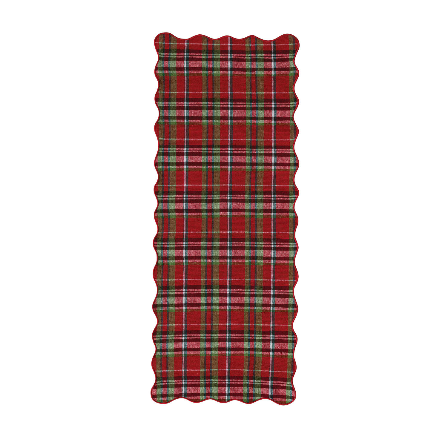 Catalog Name: 36"L x 14"W Cotton Scalloped Table Runner w/ Tartan Plaid Pattern & Stitched Edge, Multi Color, Roll Tied w/ Green Cotton Tape