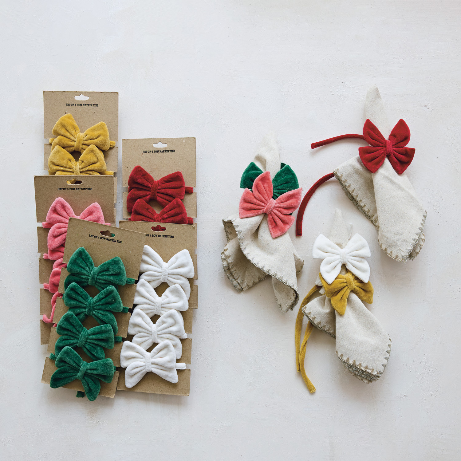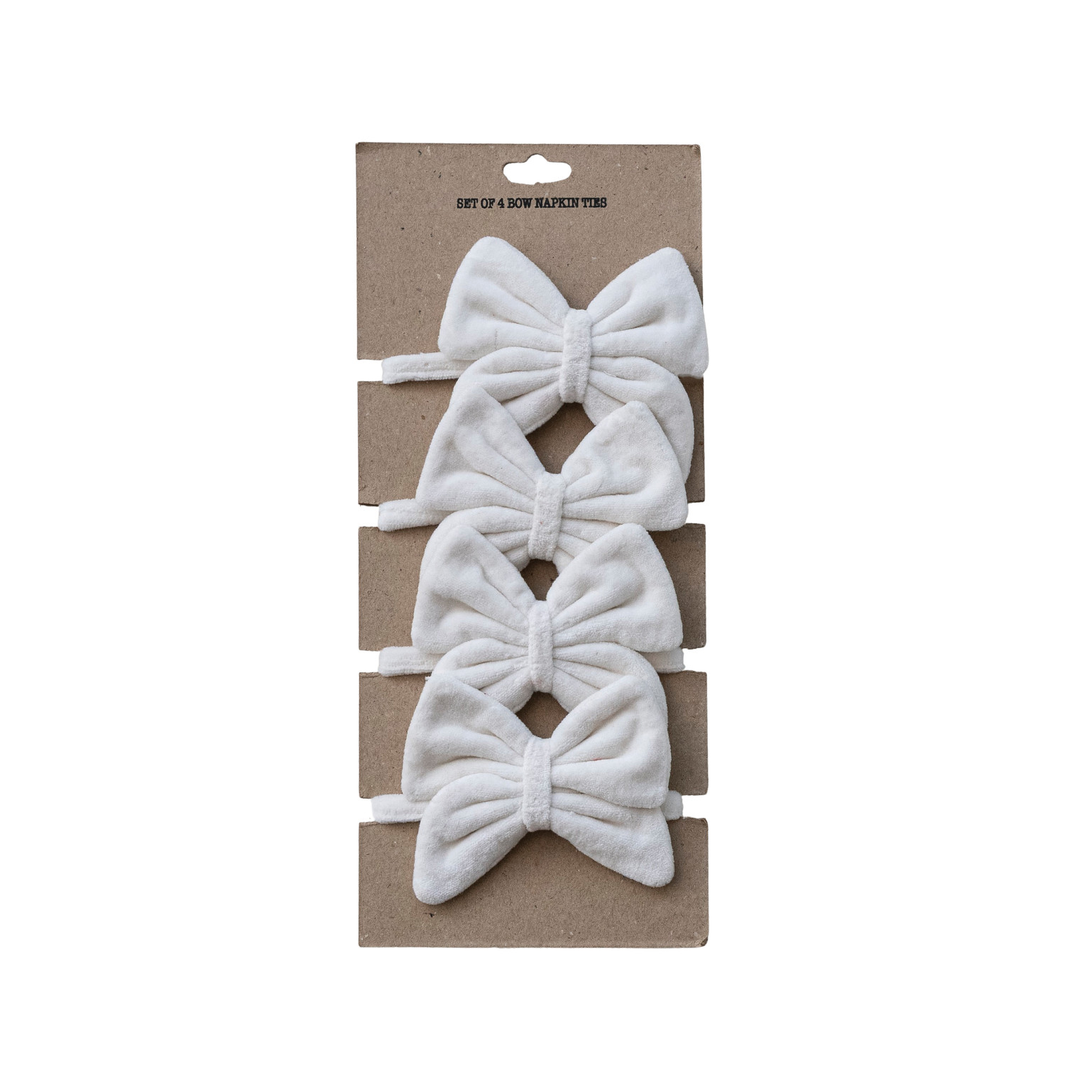 Cotton Velvet Bow Napkin Ties, White, Set of 4 on Card