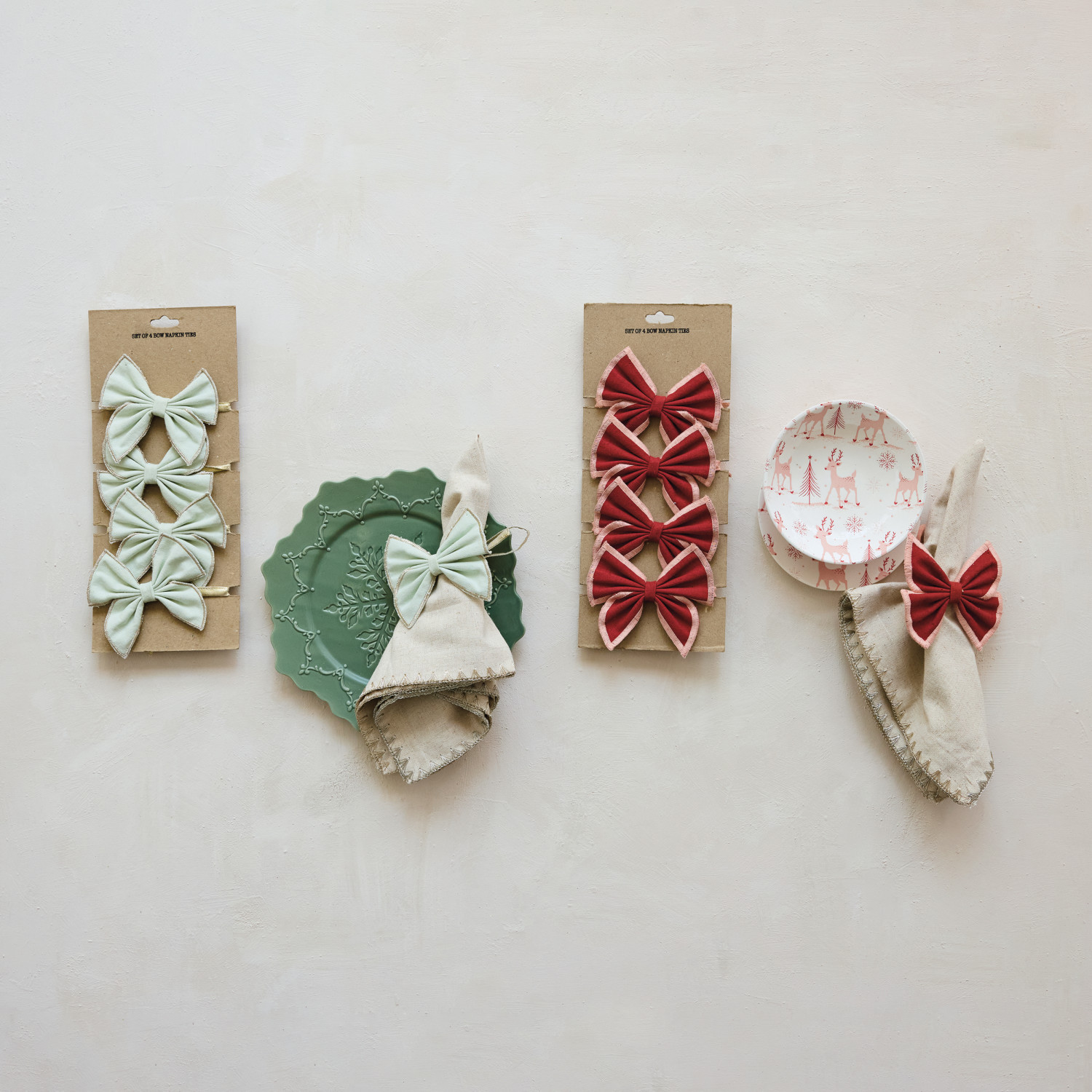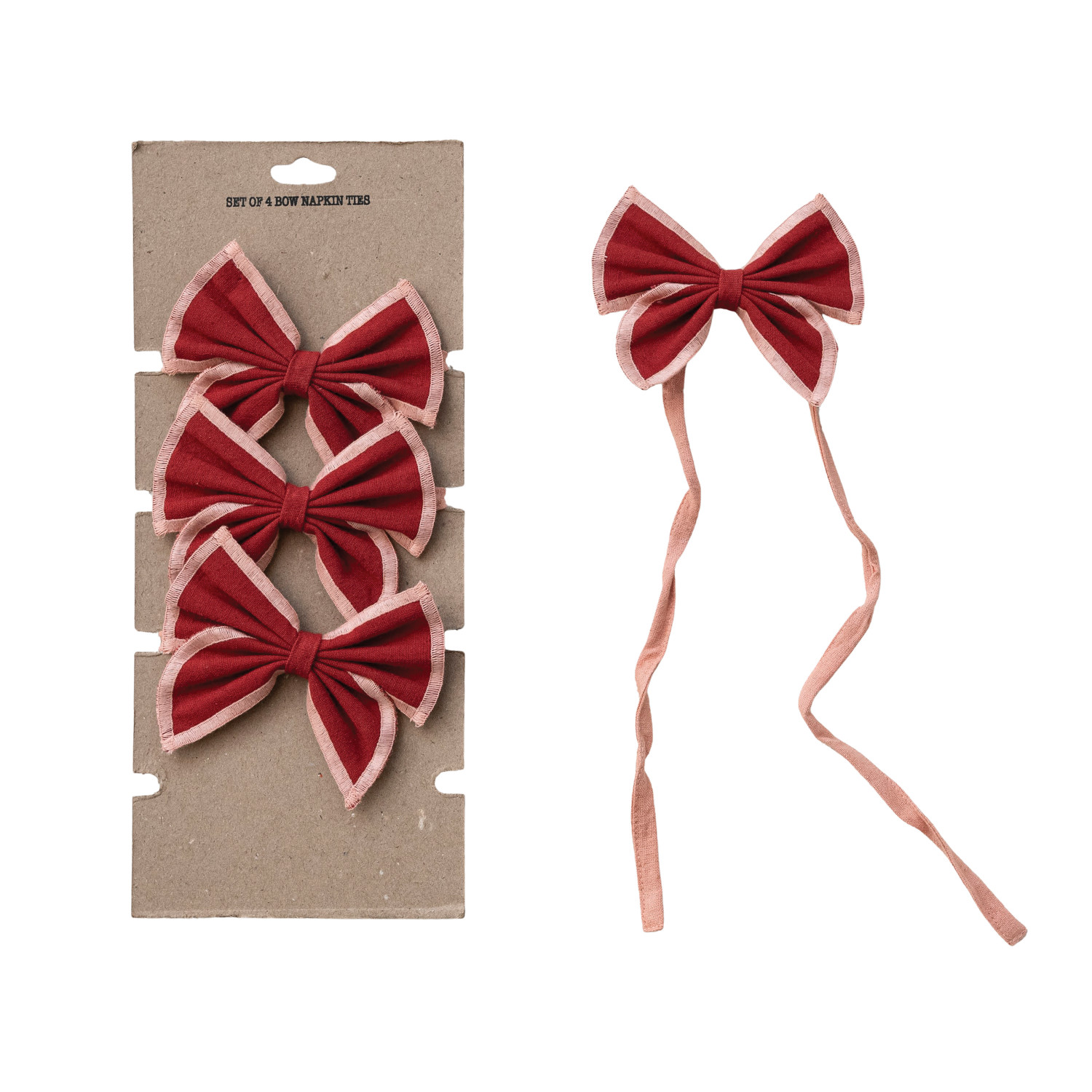 Cotton & Linen Bow Napkin Ties with Pink Stitched Edges, Red, Set of 4 on Card