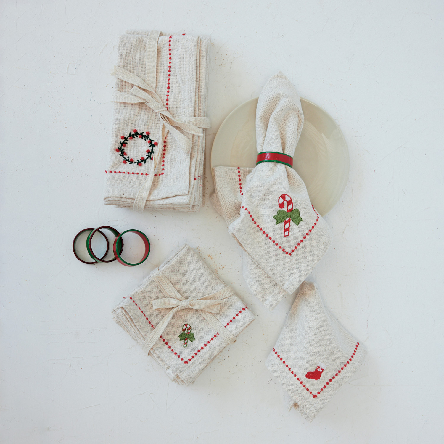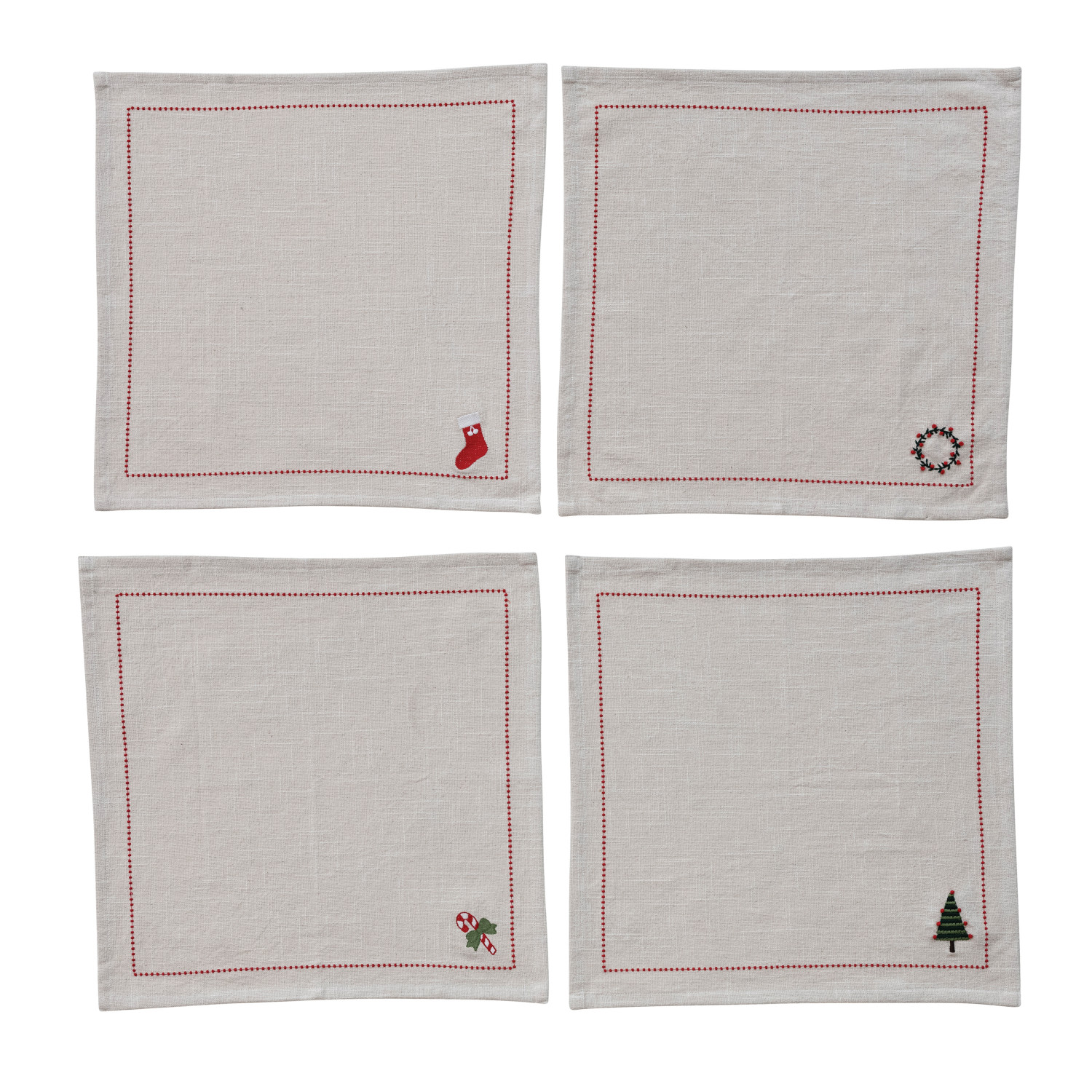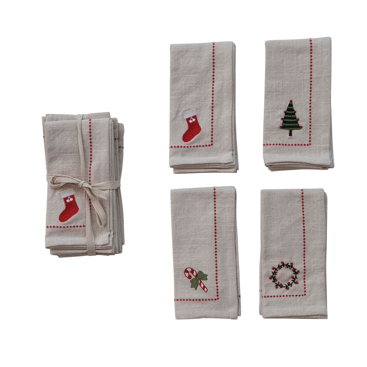 Woven Cotton Napkins with Embroidered Holiday Icons, Set of 4 Tied with Cotton Tape