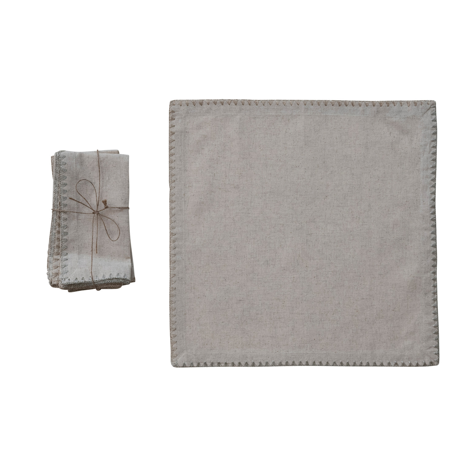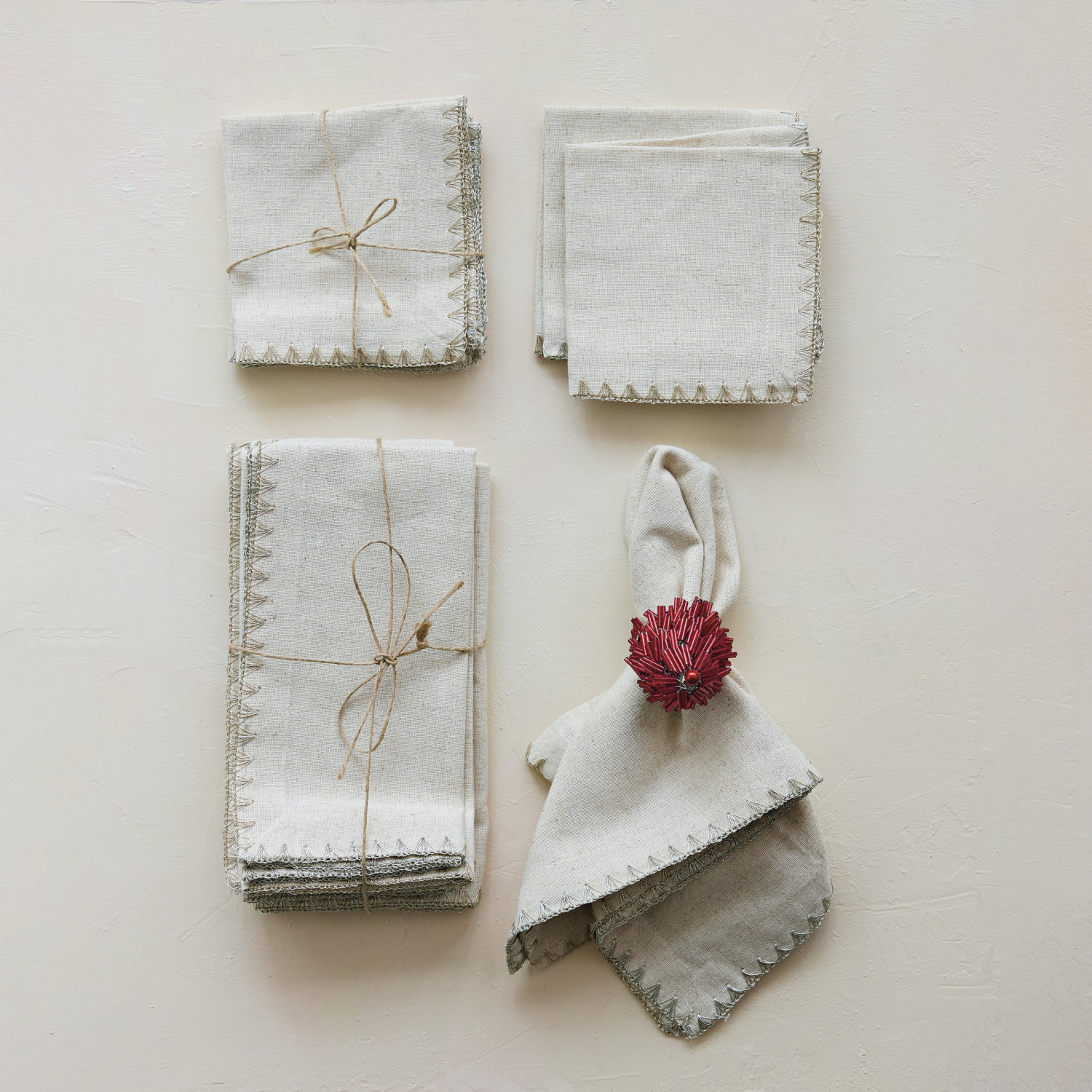 Catalog Name: 18" Square Cotton & Linen Napkins w/ Metallic Silver & Gold Thread Blanket Stitch, Natural, Set of 4 Tied w/ Jute