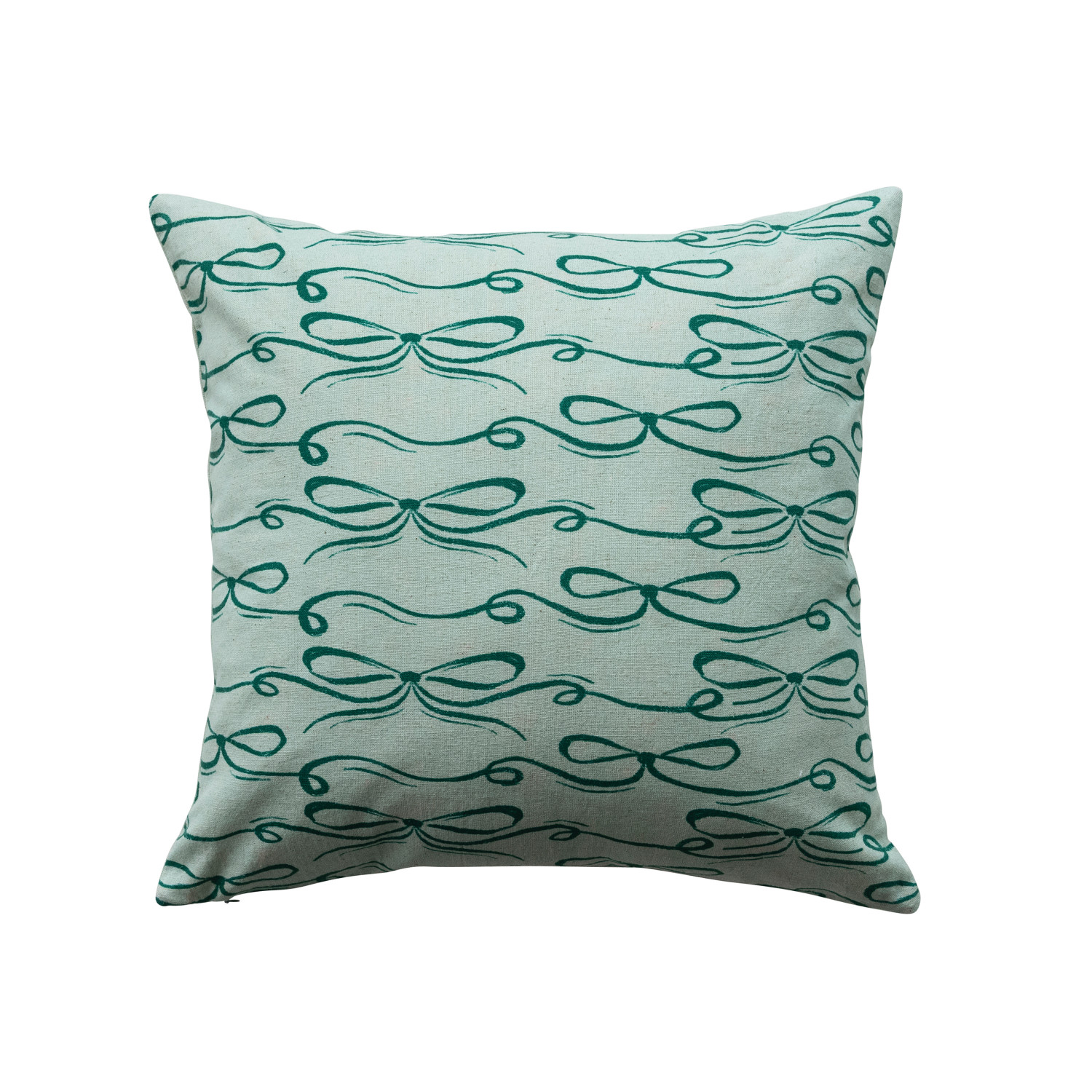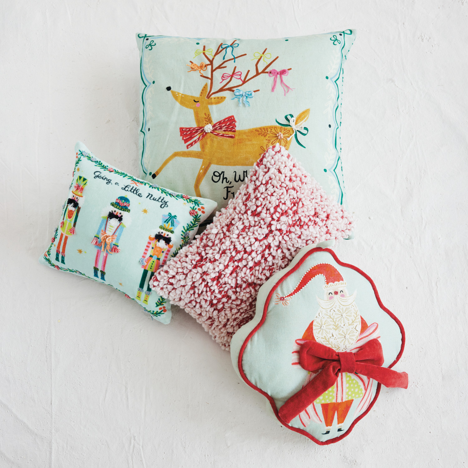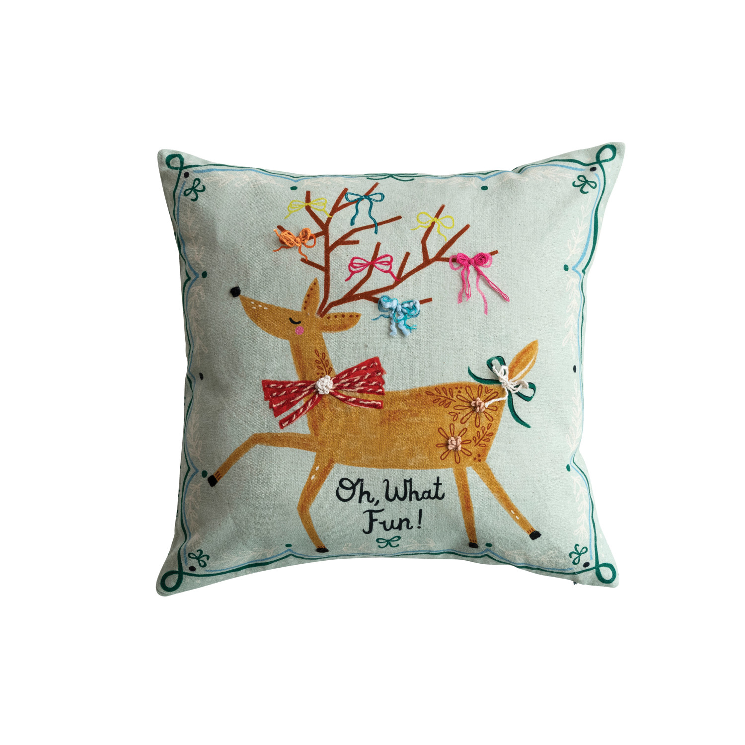 Catalog Name: 18" Square Cotton & Linen Printed Pillow w/ Reindeer, Bows, Embroidery, Applique & Patterned Back "Oh, What Fun", Multi Color ©
