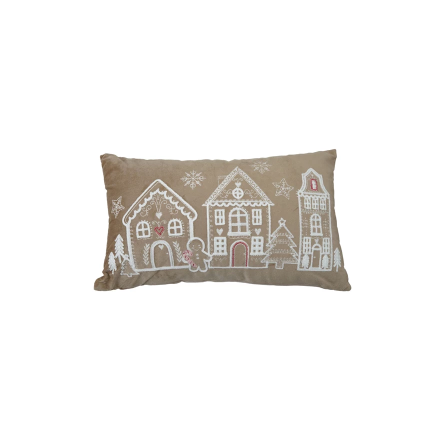 Cotton Velvet Lumbar Pillow with Embroidered Gingerbread Scene, Brown & White