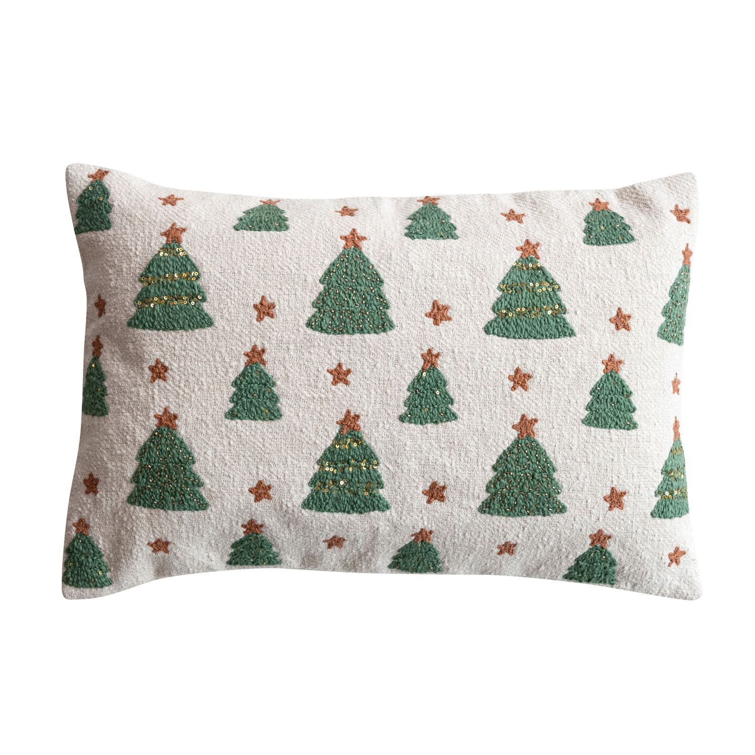 Catalog Name: 24"L x 16"H Woven Cotton Lumbar Pillow w/ Tufted Christmas Trees, Embroidery & Beads, Natural, Green & Gold Color