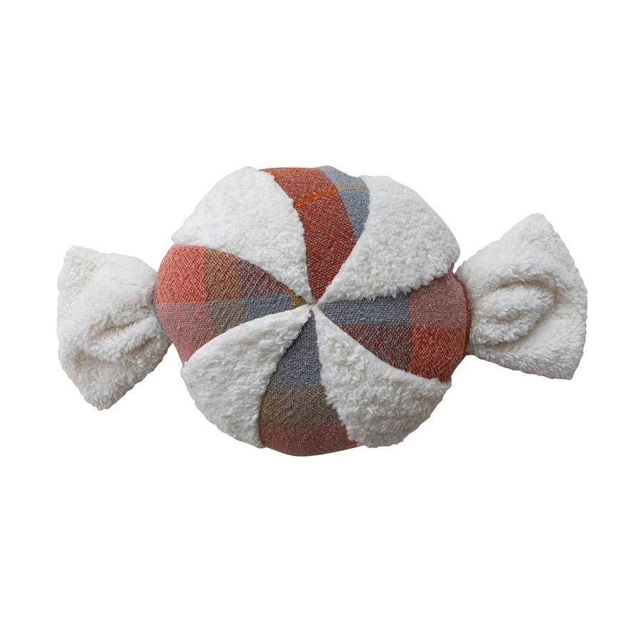 Woven Fabric Striped Candy Pillow with Plaid Pattern & Faux Sherpa Stripes