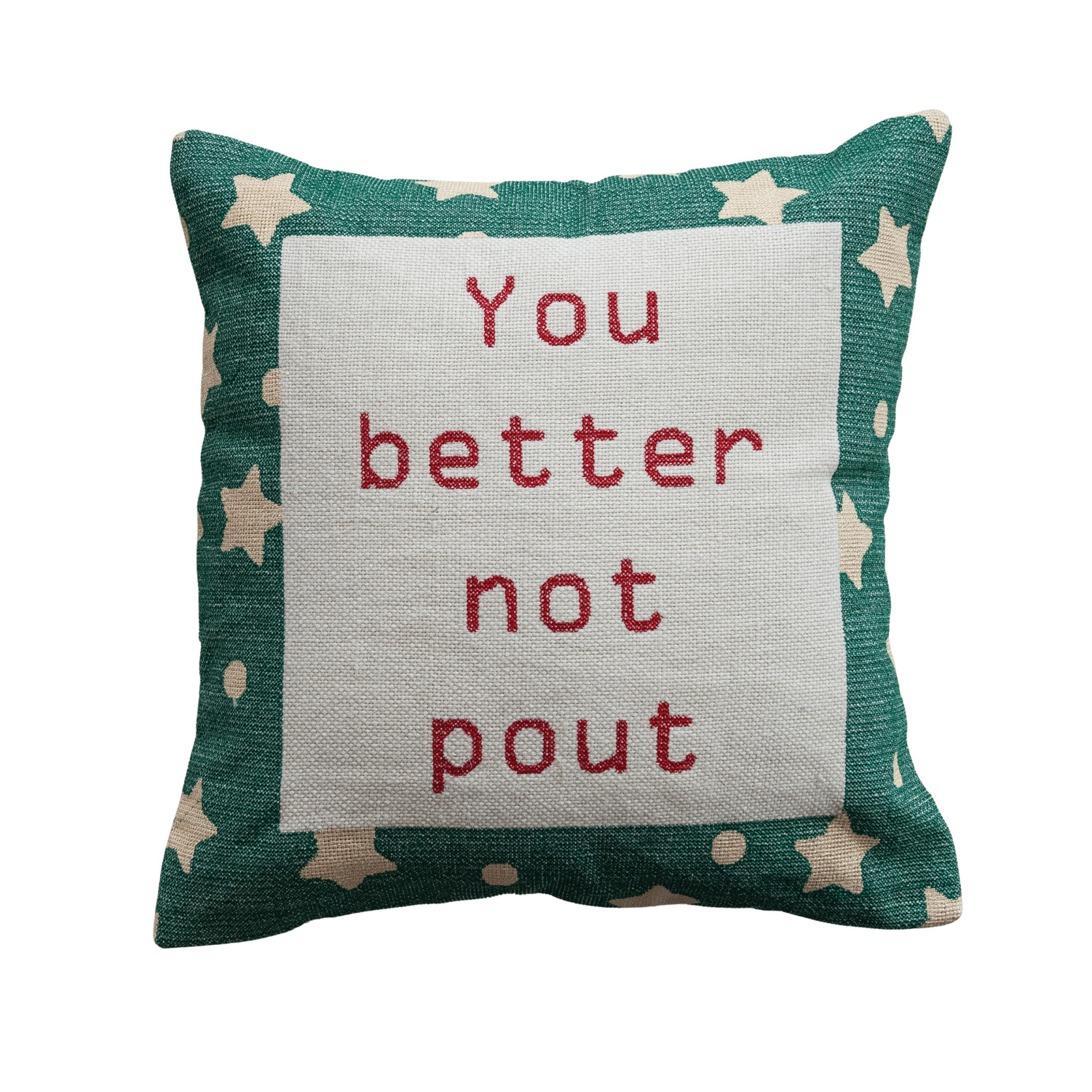 16" Square Cotton Embroidered Pillow with Star Pattern "You Better Not Pout"