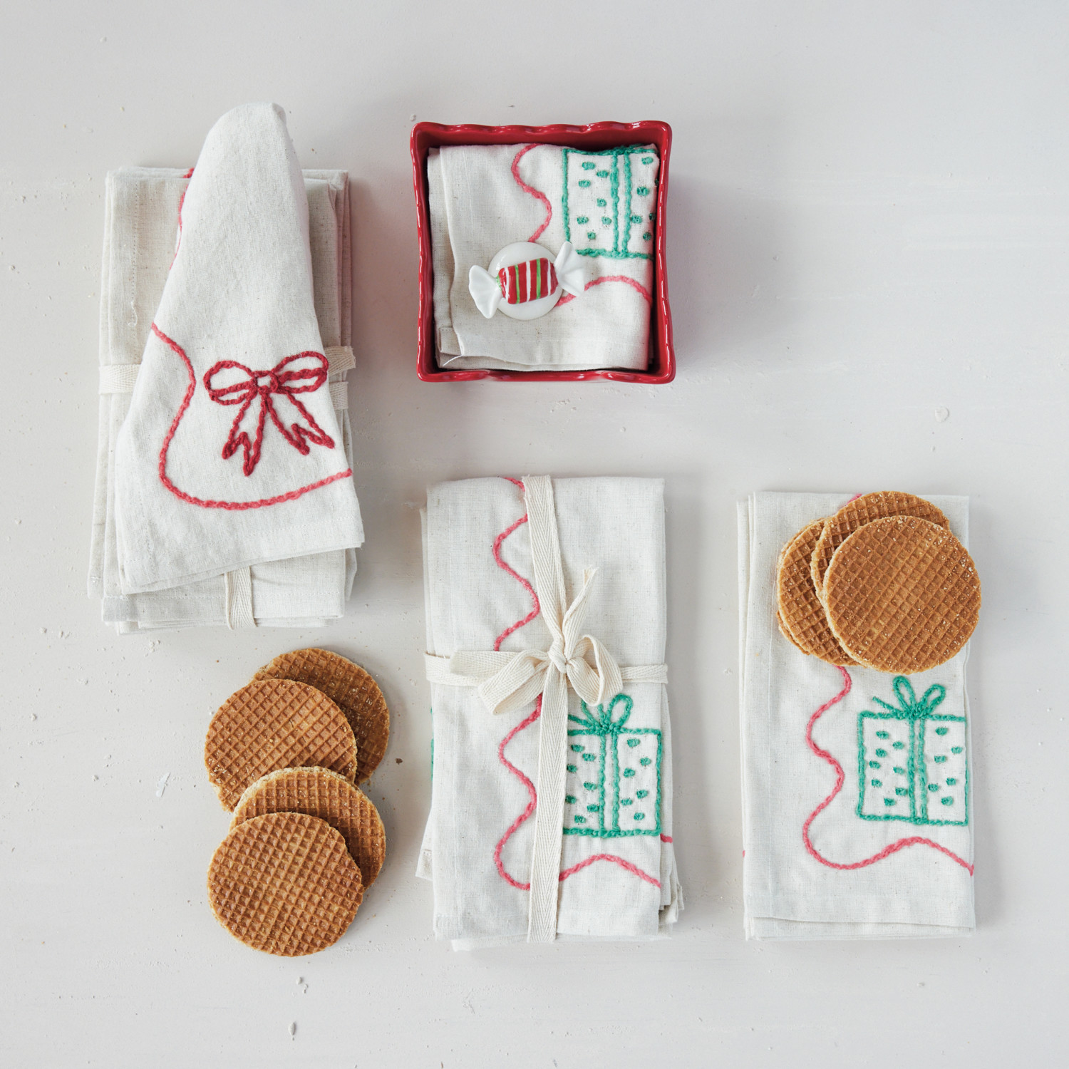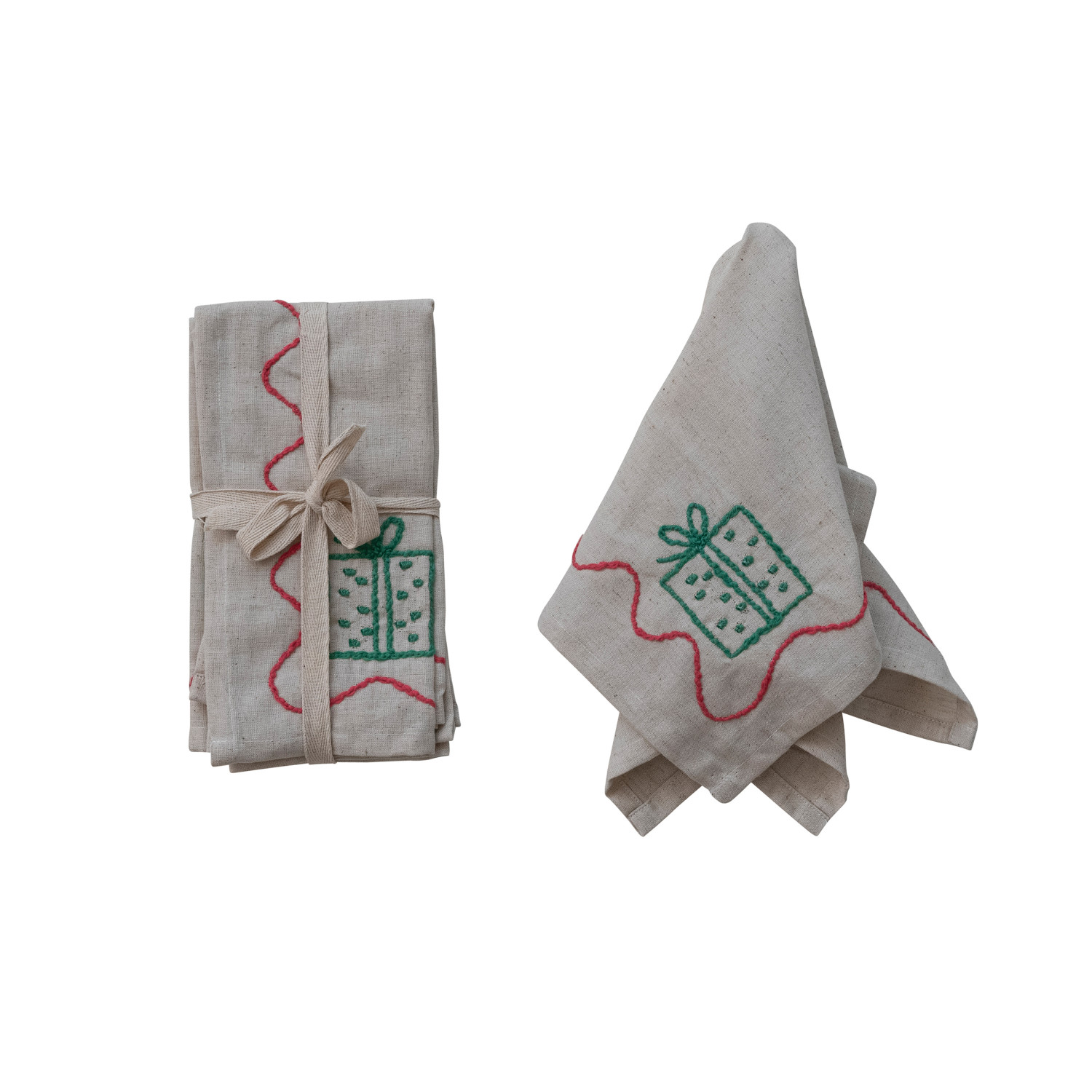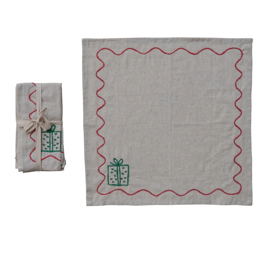Cotton & Linen Napkins with Embroidered Gift Box, Set of 4 Tied with Cotton Tape