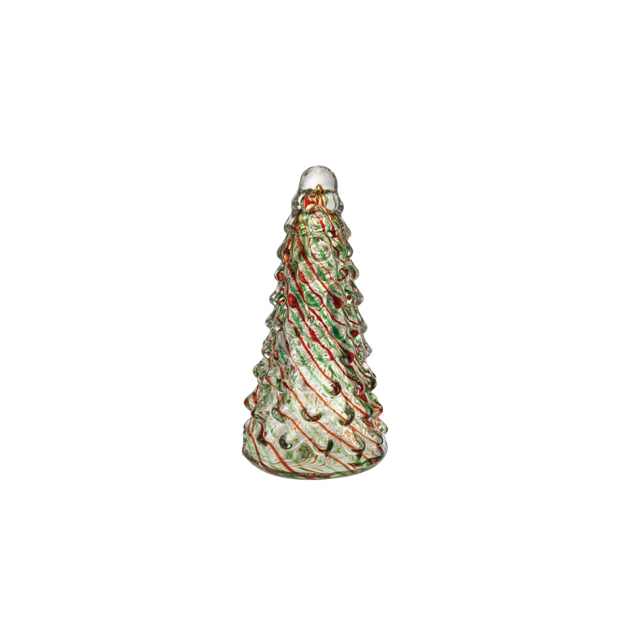 Catalog Name: 3-1/4" Round x 6-3/4"H Hand-Blown Art Glass Tree w/ Candy Stripes, Red & Green