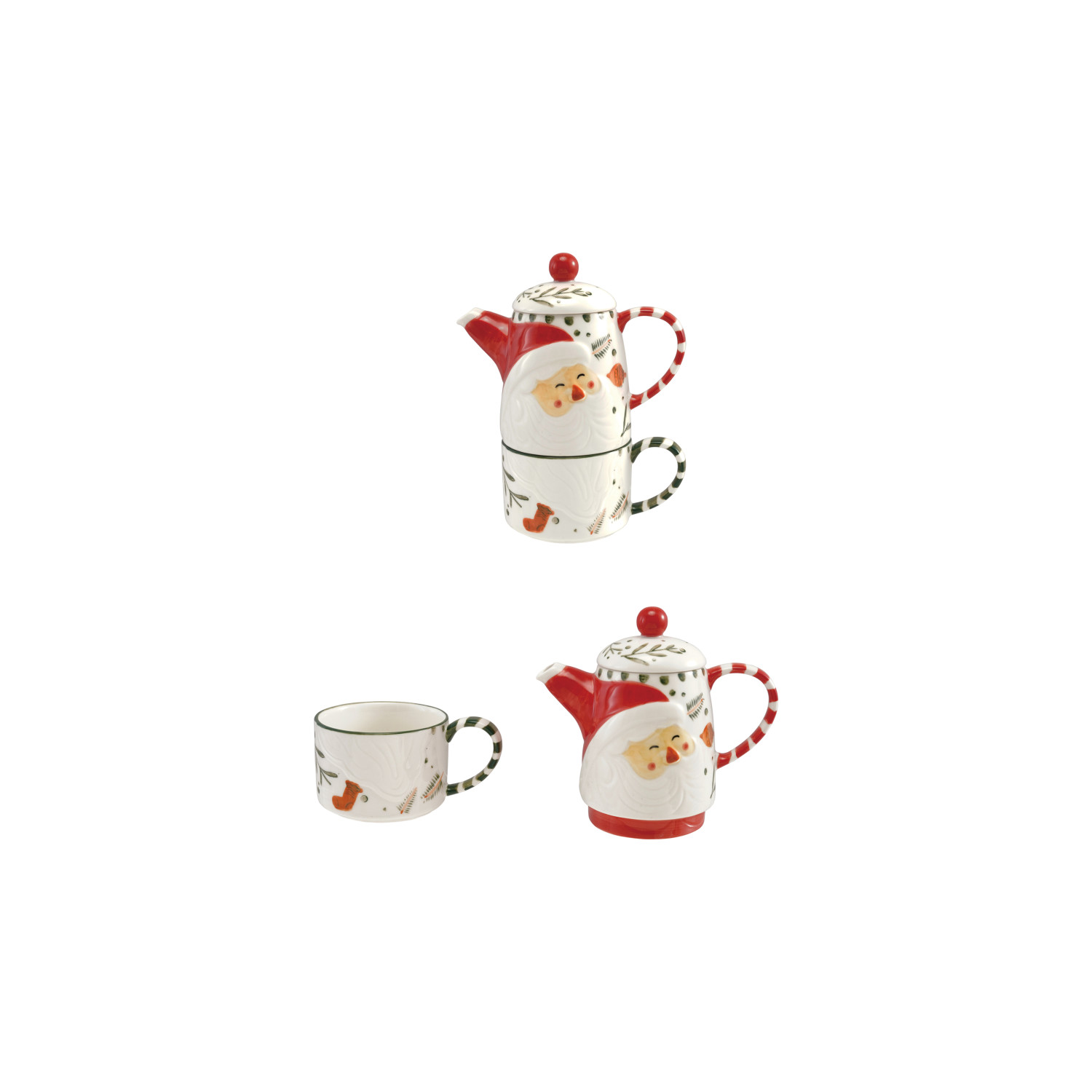 Catalog Name: 6"L x 3-3/4"W x 8"H 12 oz. Stoneware Tea For One w/ Santa & Striped Handles, Multi Color, Set of 2