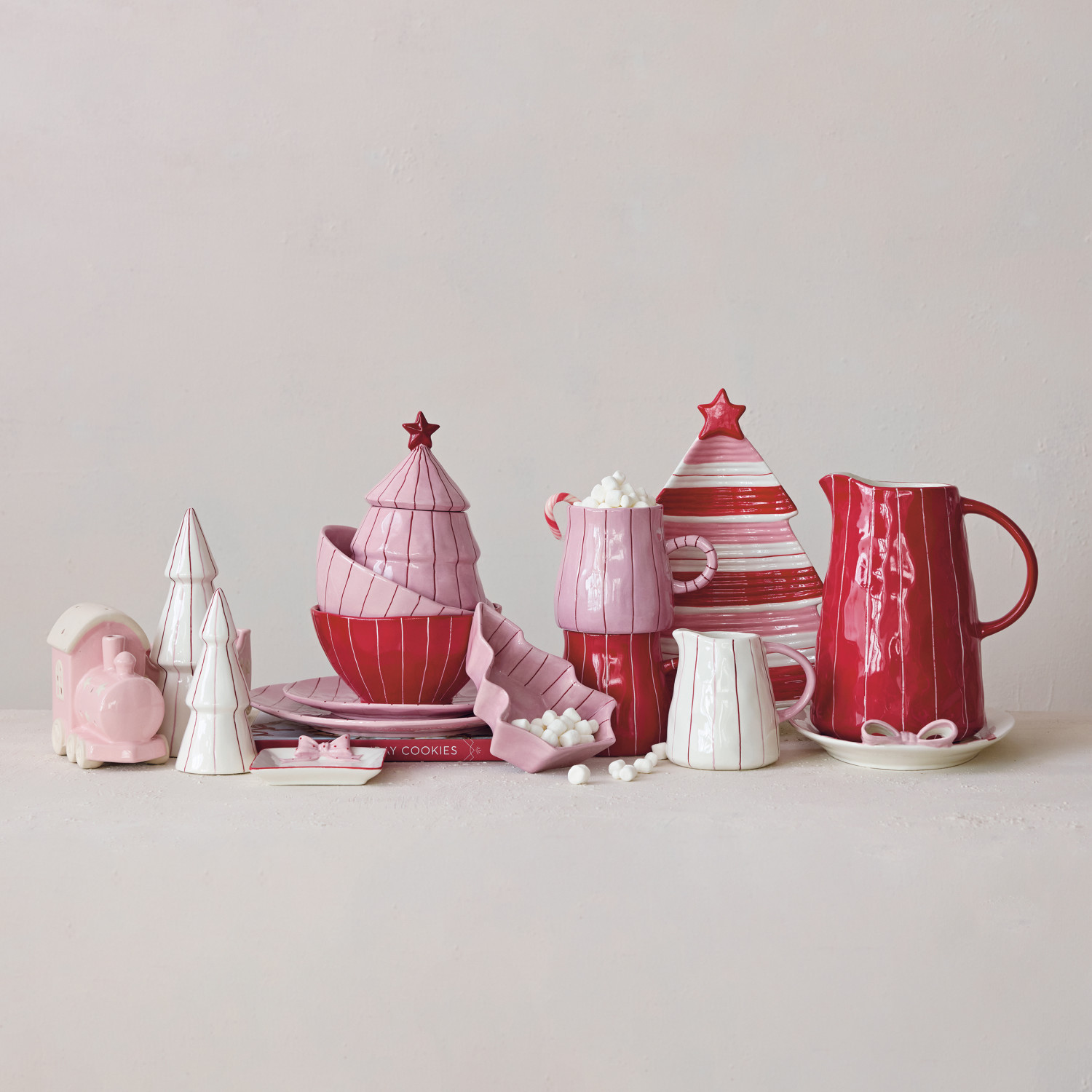 Catalog Name: 2-3/4" Round x 5-3/4"H Hand-Painted Stoneware Striped Tree, White, Pink & Red