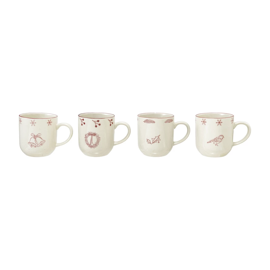 Catalog Name: 3-3/4" Round x 4"H 12 oz. Hand-Stamped Stoneware Mug w/ Holiday Image, White & Burgundy, 4 Styles