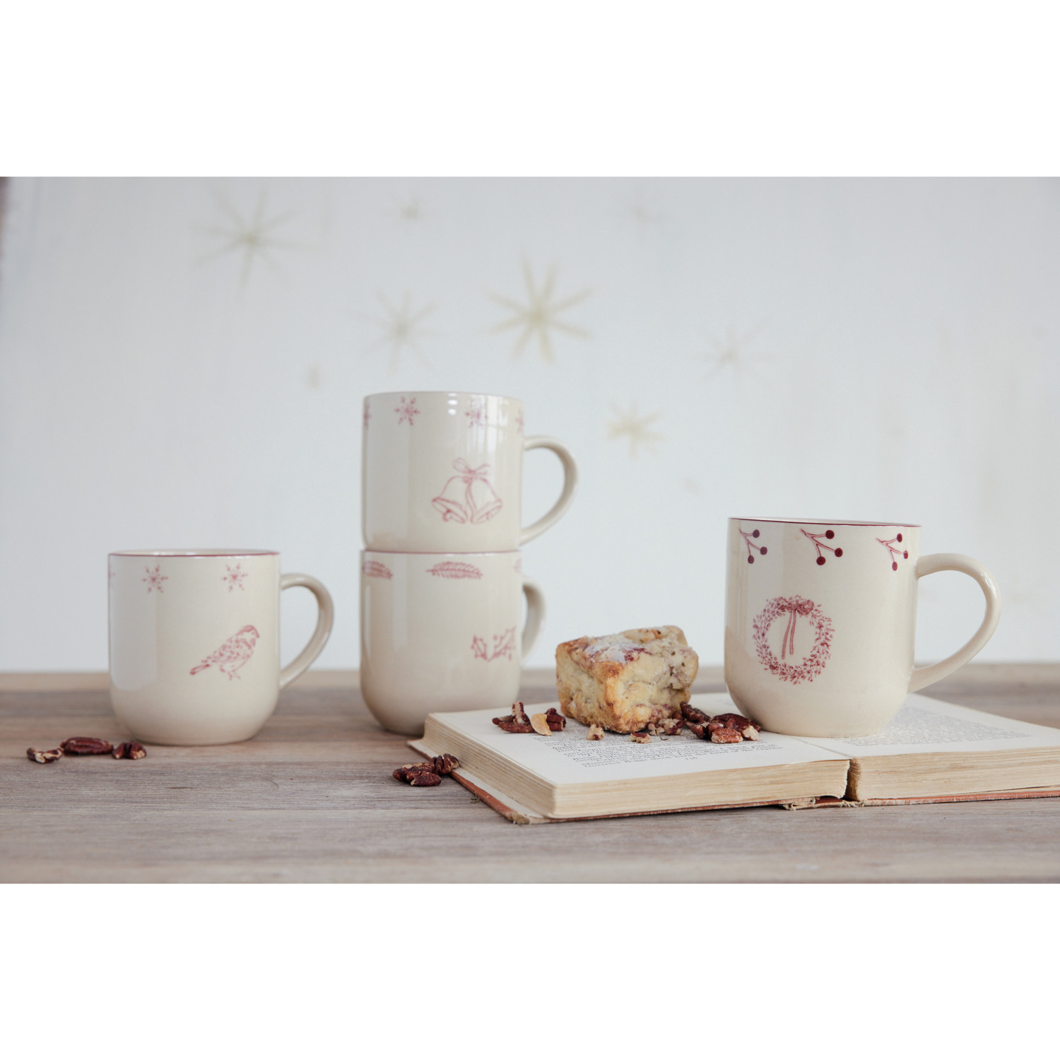 12 oz. Hand-Stamped Stoneware Mug with Holiday Image, White & Burgundy, 4 Styles