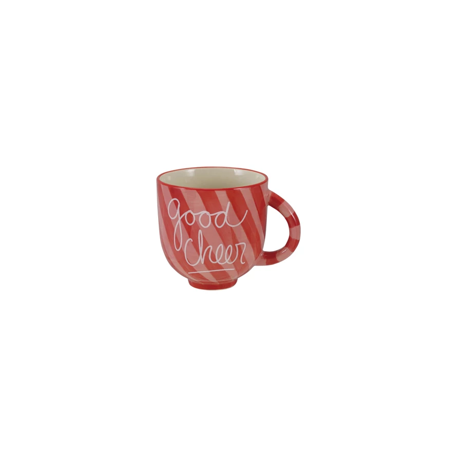 14 oz. Hand-Painted Stoneware Striped Mug "Good Cheer", Red & White ©