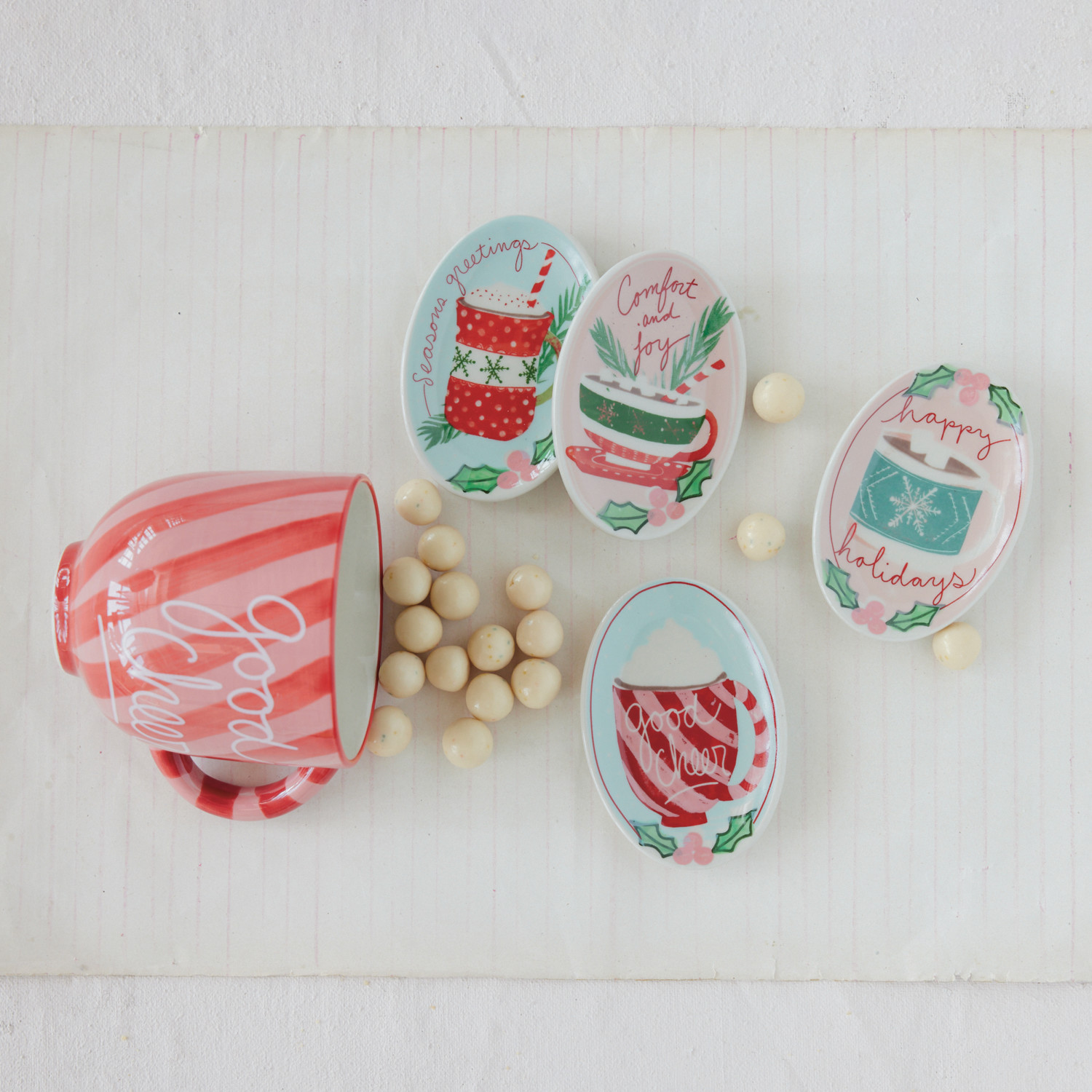 14 oz. Hand-Painted Stoneware Striped Mug "Good Cheer", Red & White ©