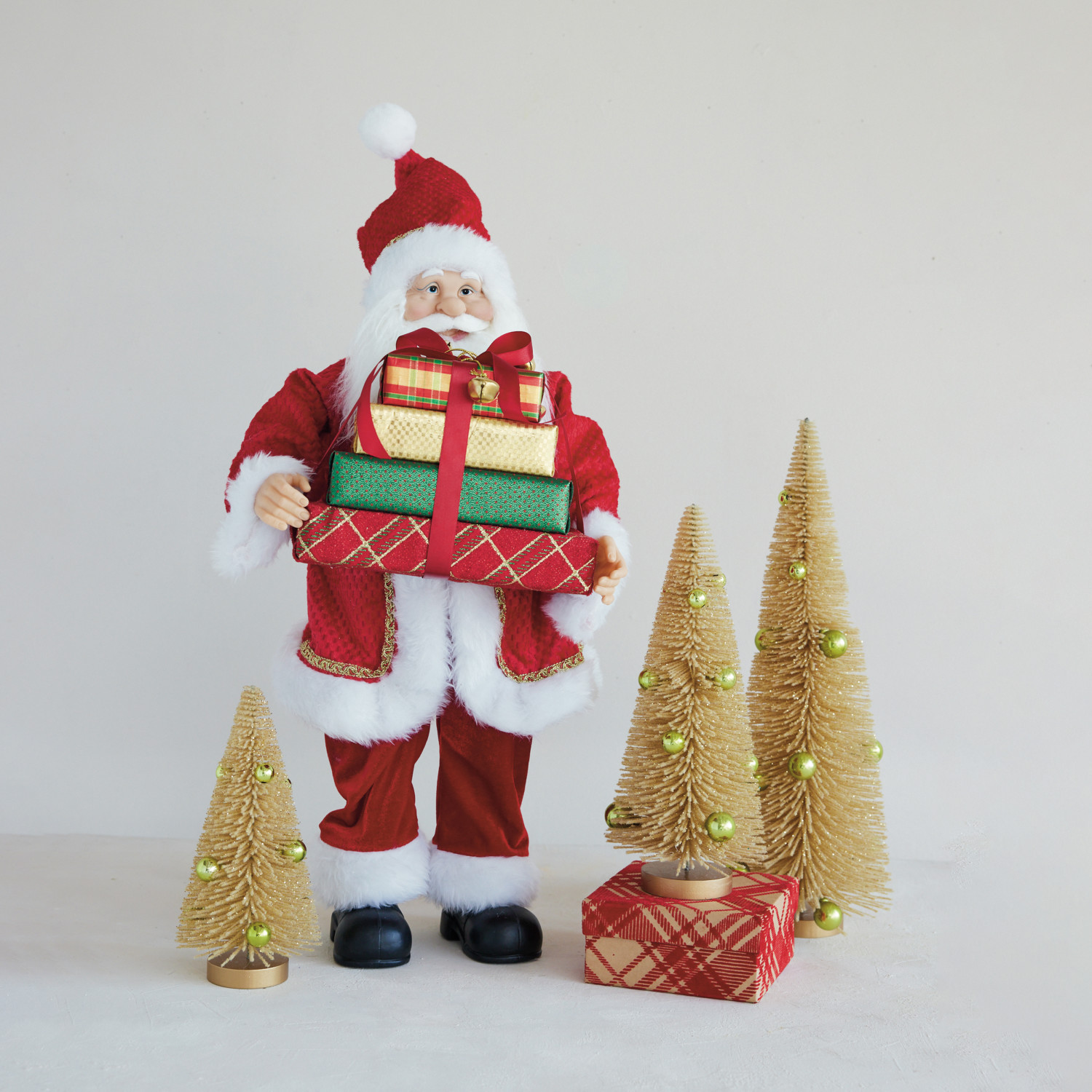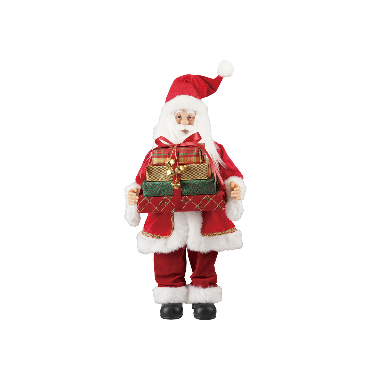 Catalog Name: 12"L x 9"W x 24"H Fabric & Faux Fur Santa w/ Presents & Jingle Bells, Multi Color