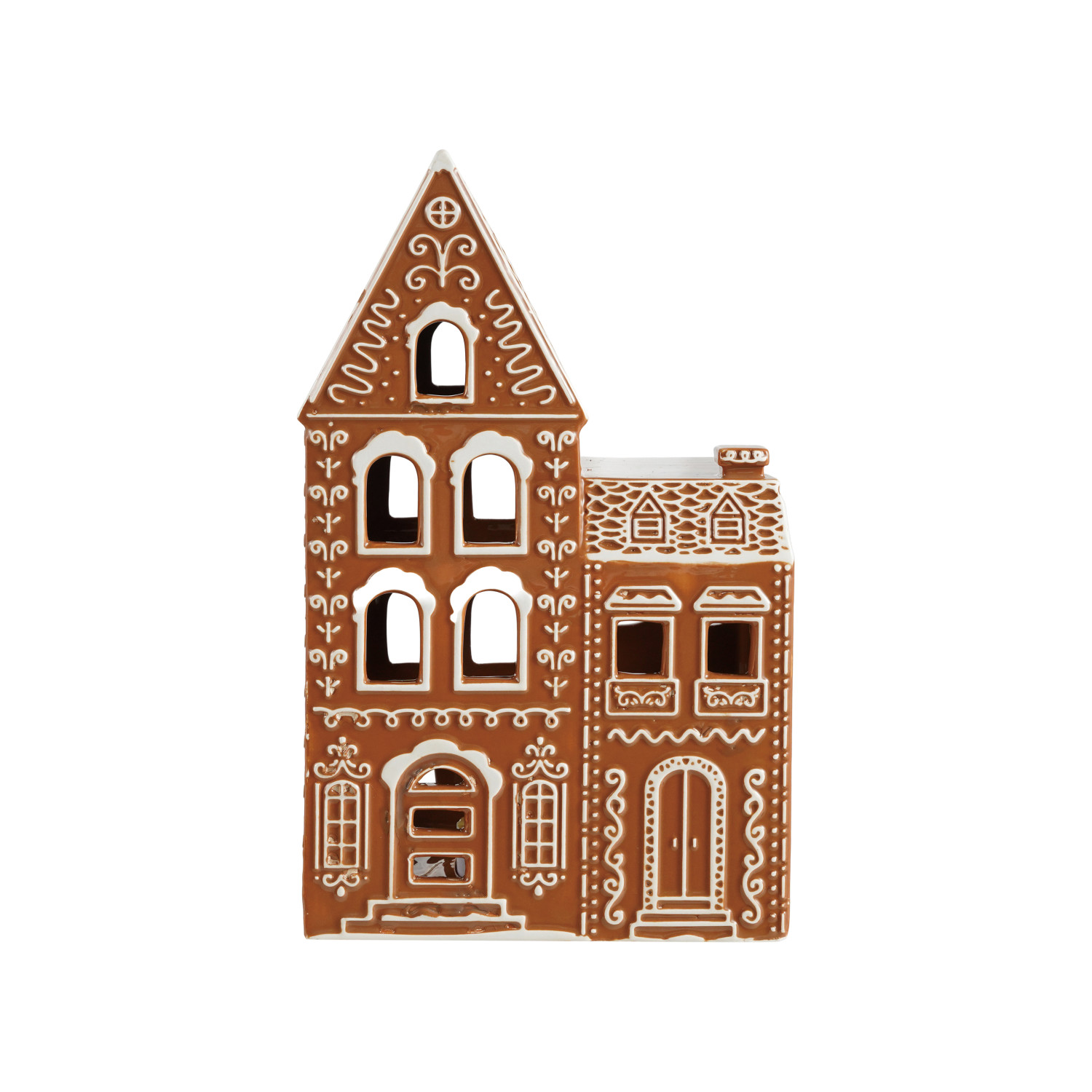 Catalog Name: 7-1/4"L x 4-1/2"W x 12"H Hand-Painted Ceramic Gingerbread House w/ Embossed Design, Brown & White