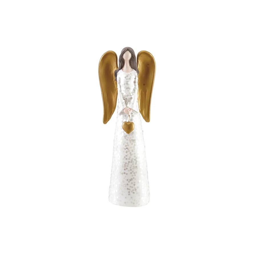 Catalog Name: 3"L x 2"W x 8-1/4"H Resin Angel w/ Heart & Glitter, White, Gold Finish & Brown