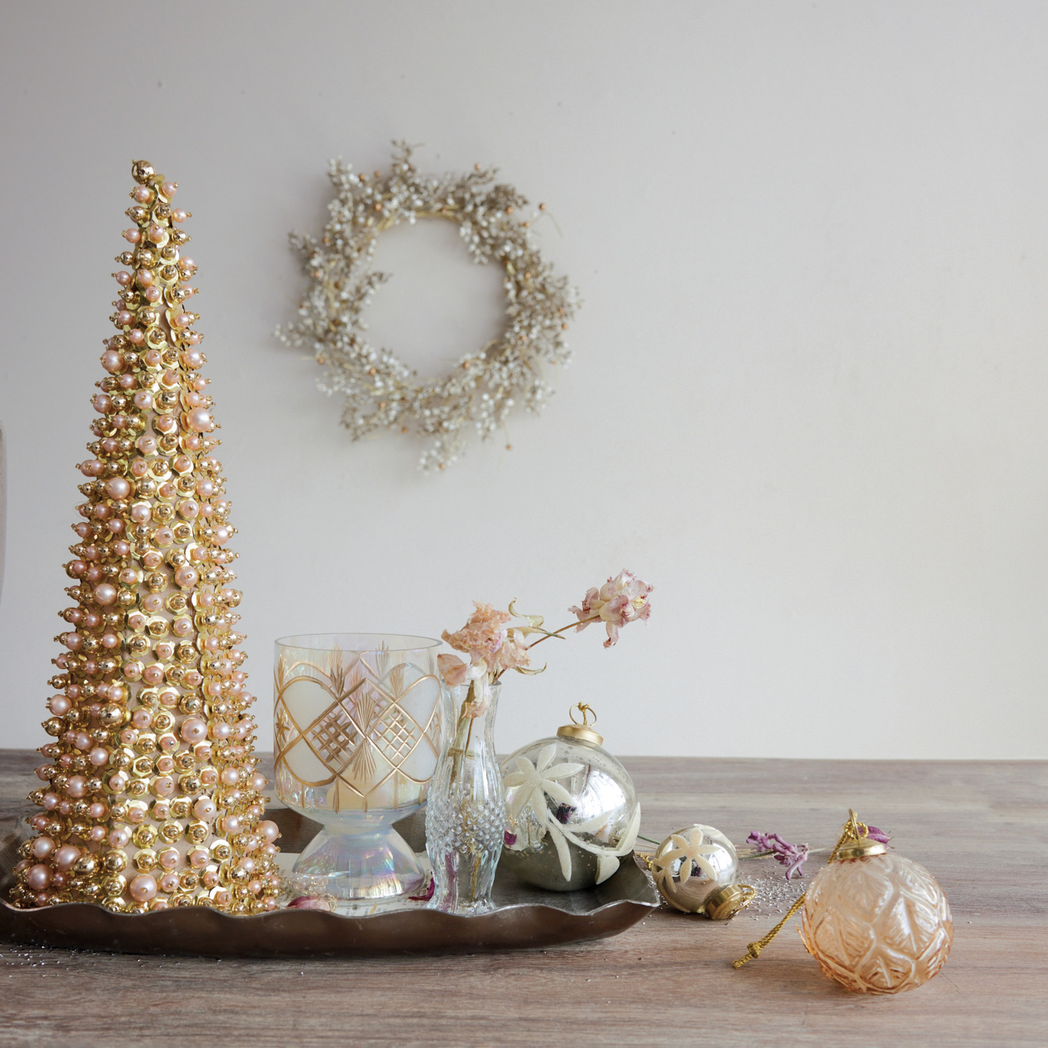 Catalog Name: 5-1/4" Round x 16"H & 4-1/4" Round x 12-1/4"H Faux Pearl & Glass Beaded Trees w/ Sequins, Gold Finish & Pink, Set of 2