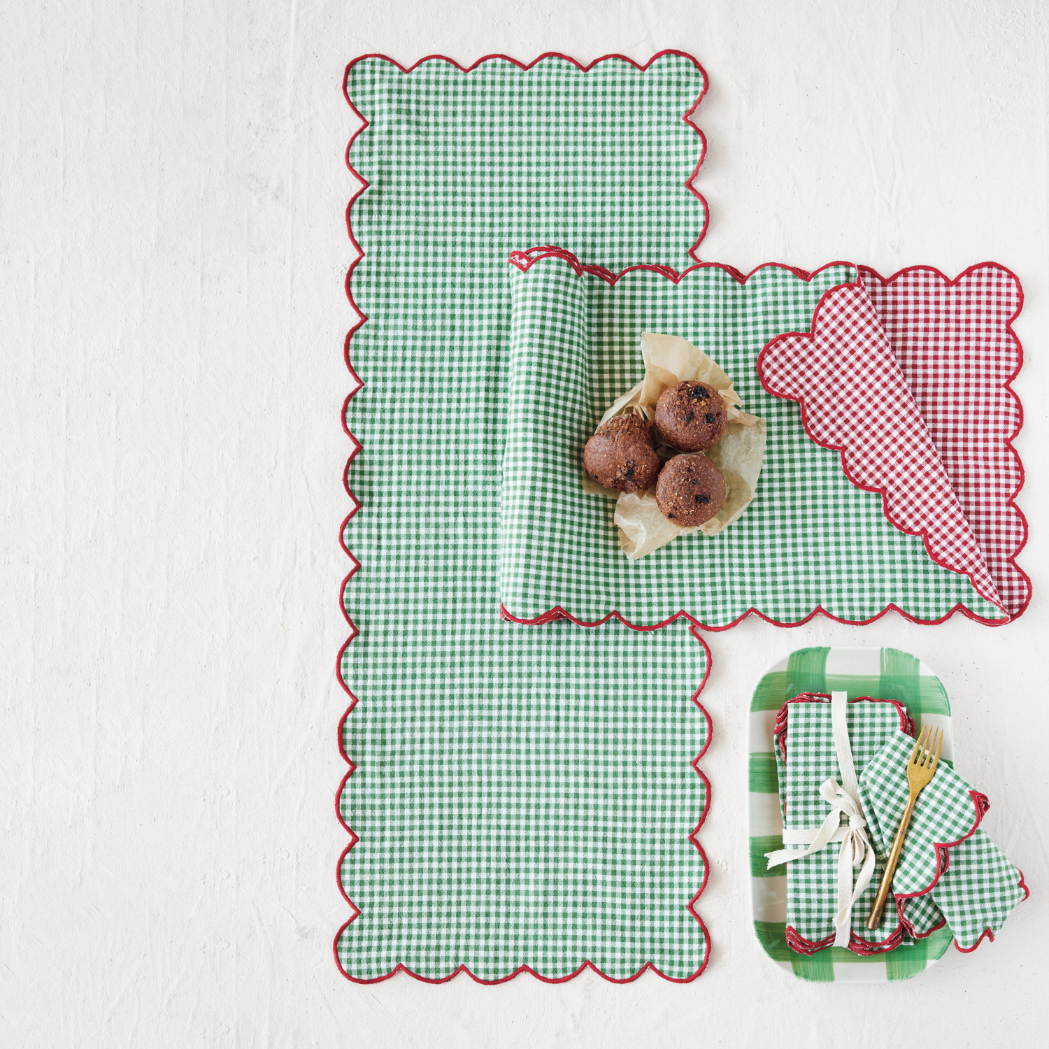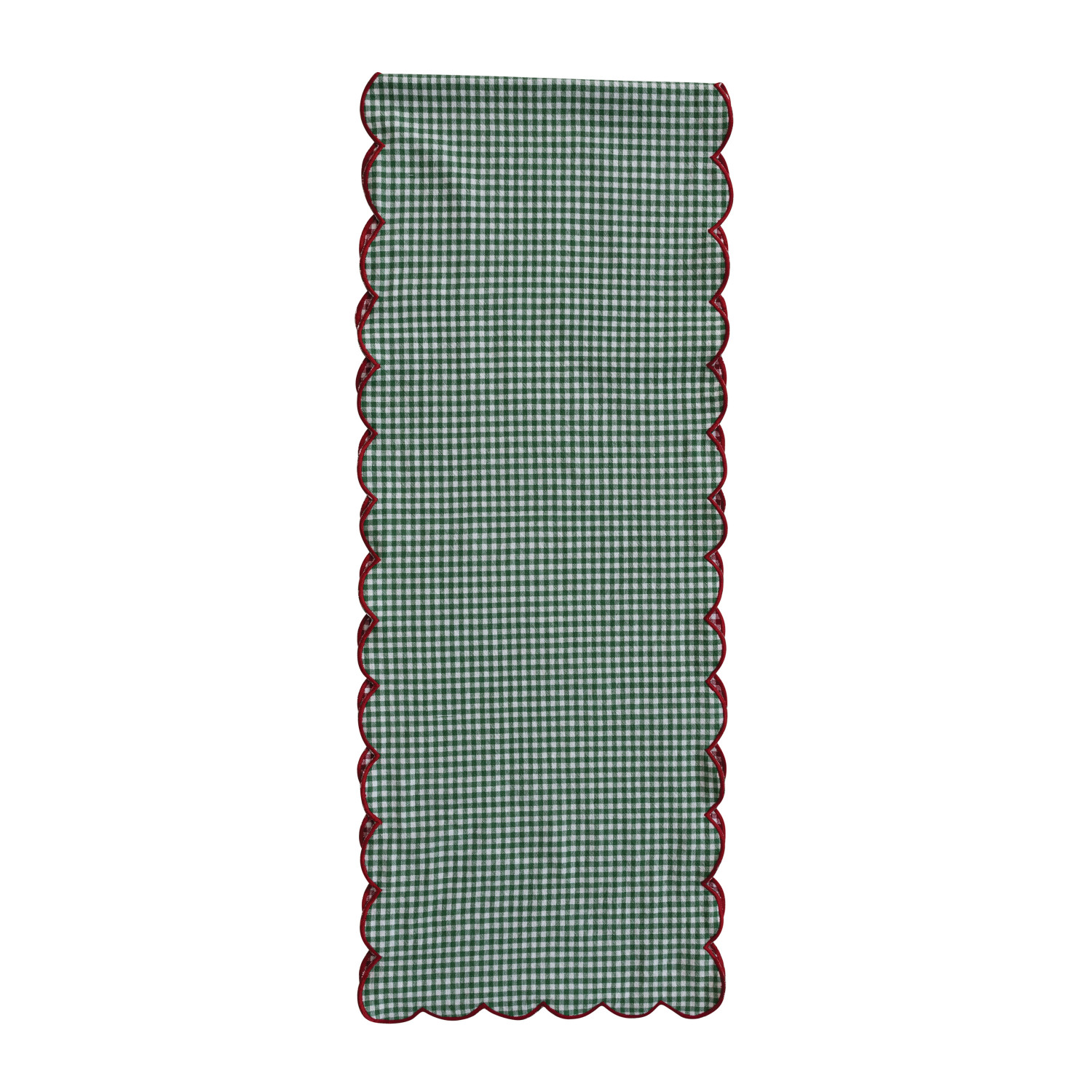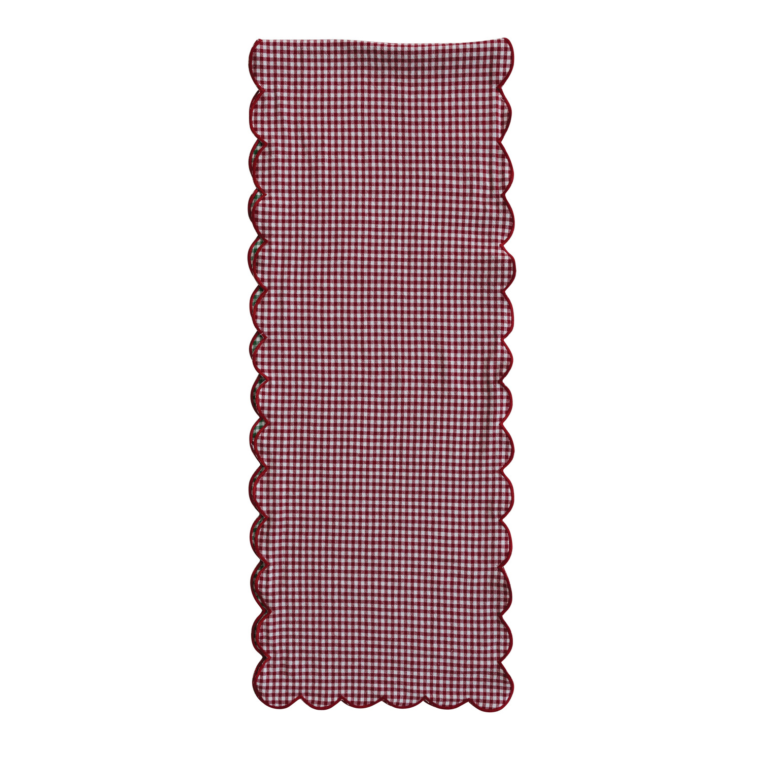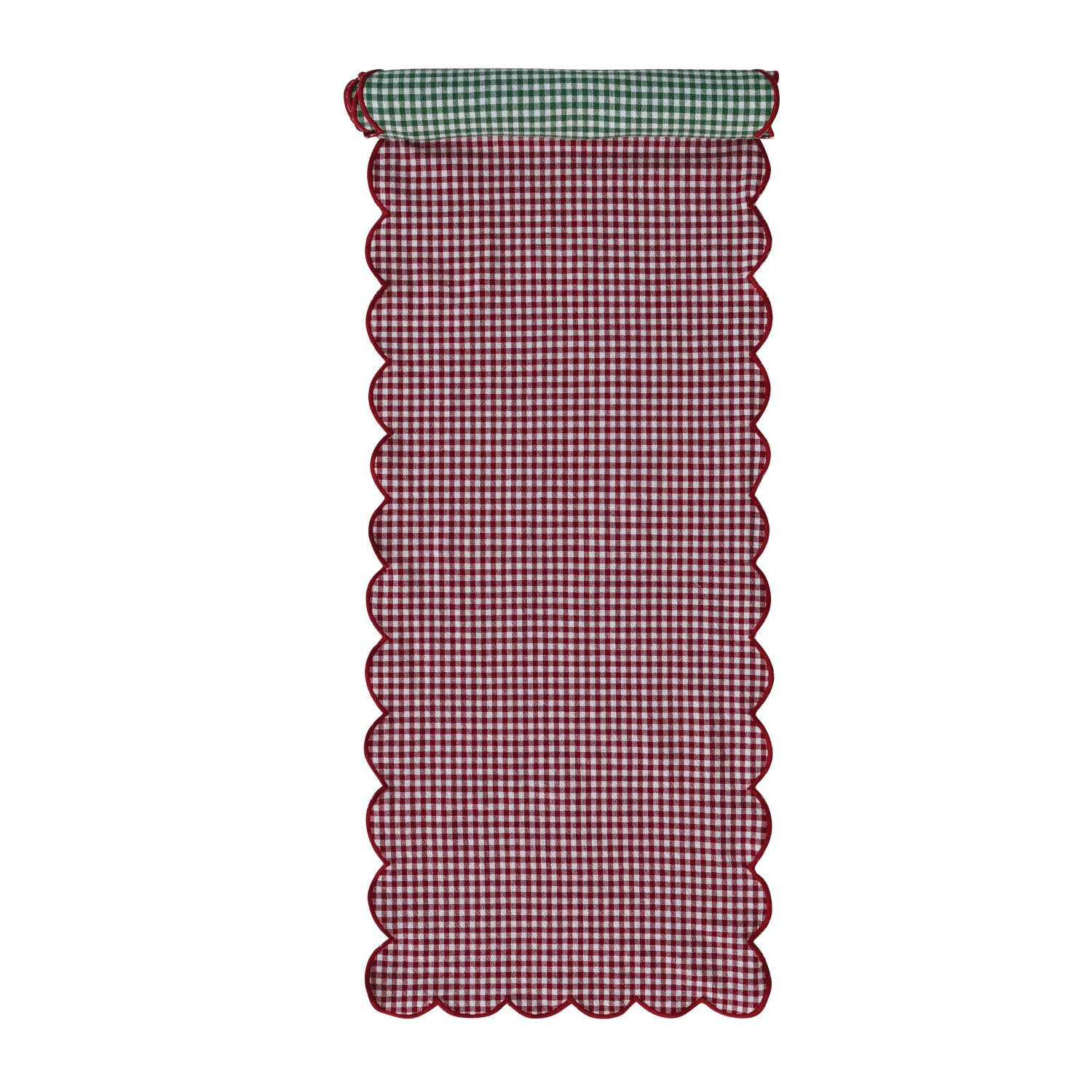 Catalog Name: 72"L x 14"W Woven Cotton Scalloped Two-Sided Table Runner w/ Gingham Pattern & Contrasting Stitched Edge, Red, Green & White, Roll Tied w/ Cotton Tape