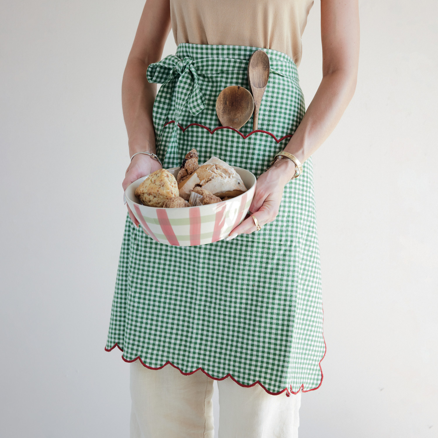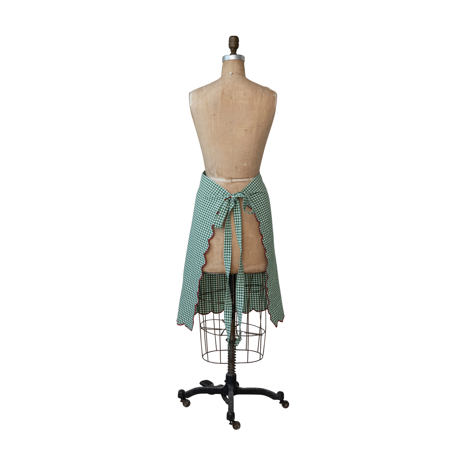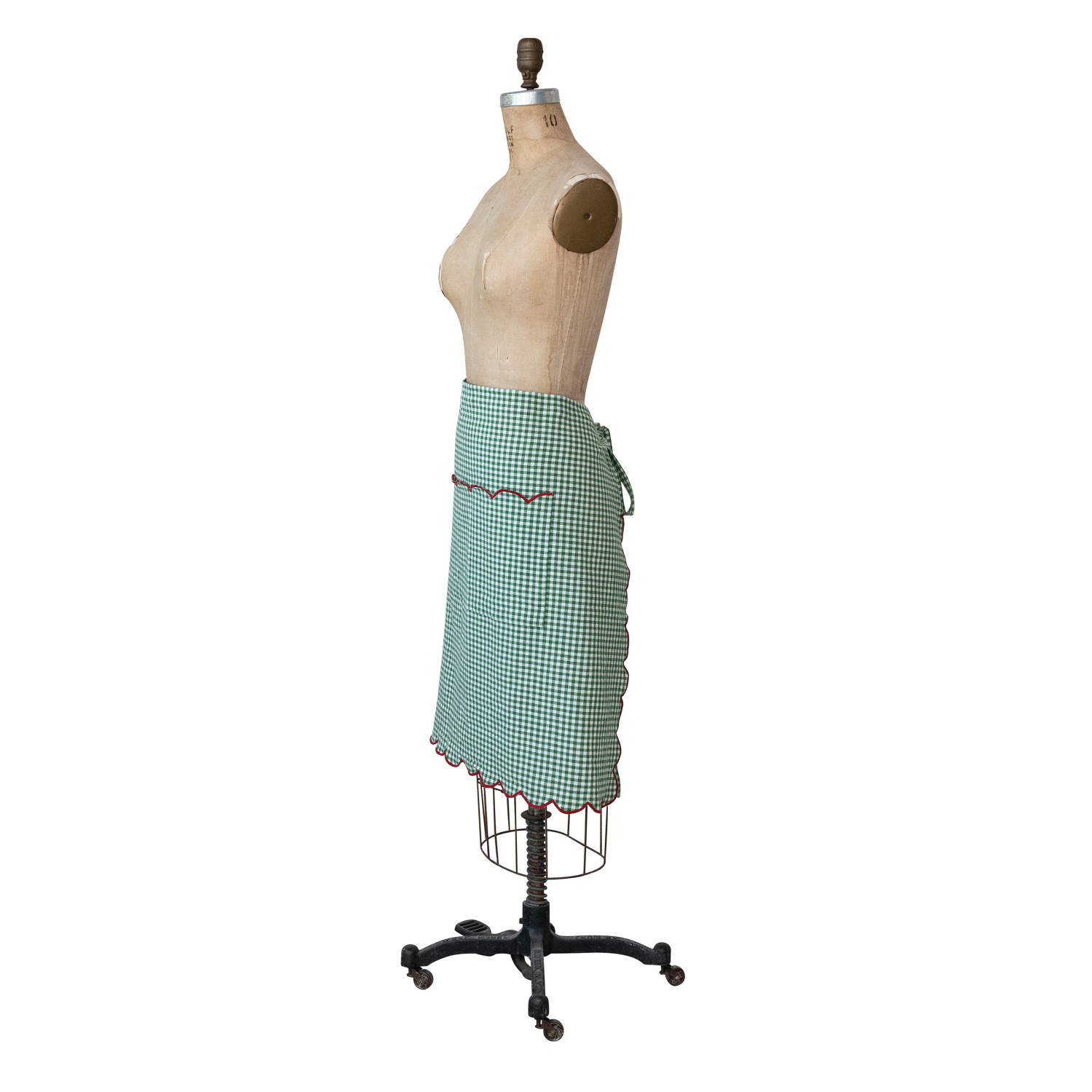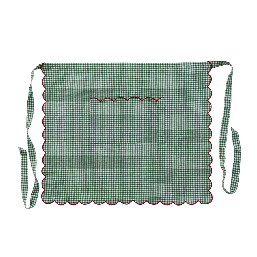Catalog Name: 30"L x 25"W Woven Cotton Scalloped Half Apron w/ Gingham Pattern, Contrasting Stitched Edge & Pocket, Green, White & Red