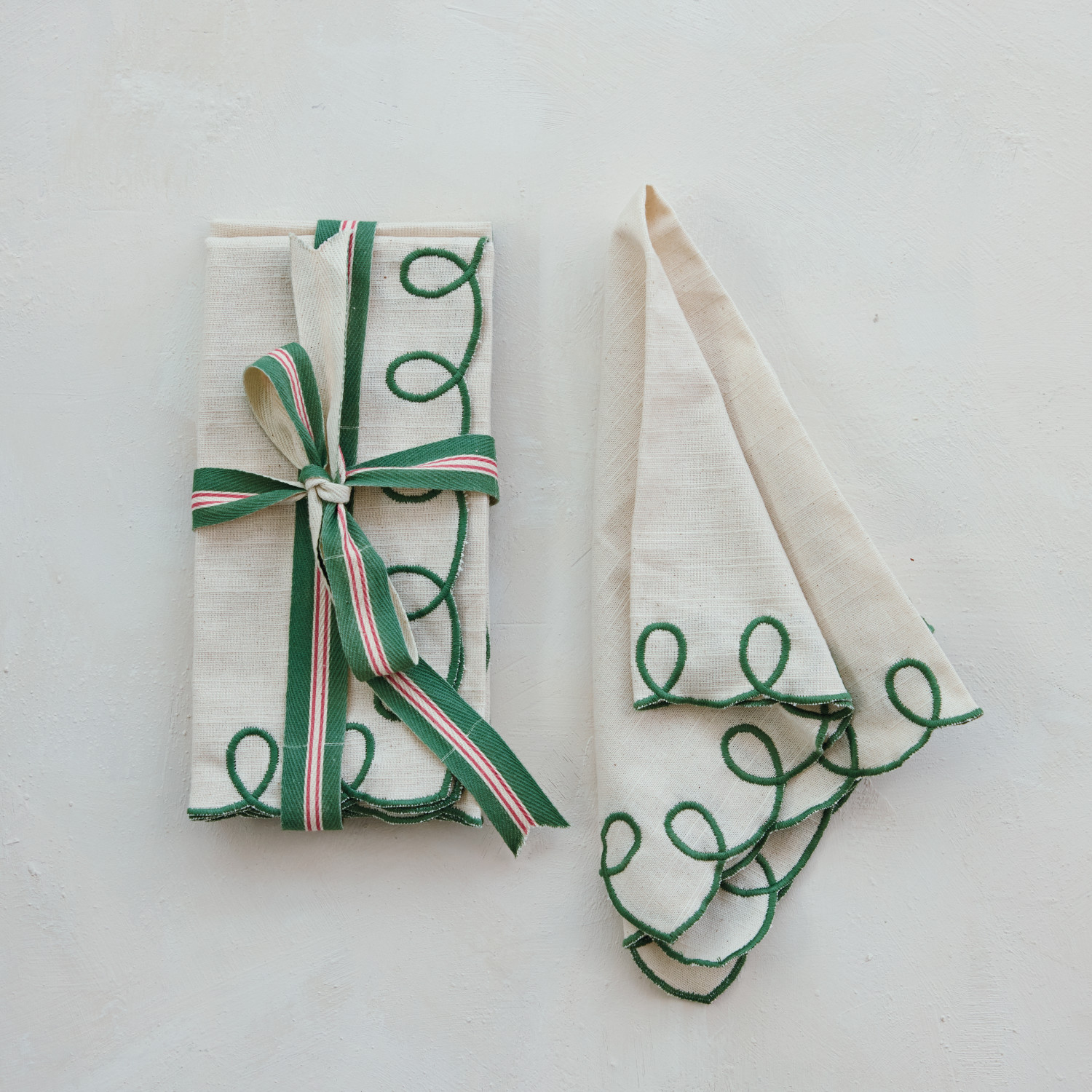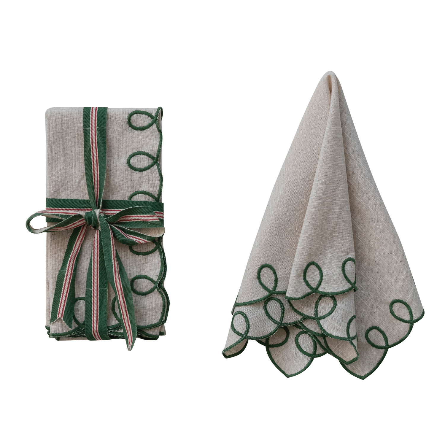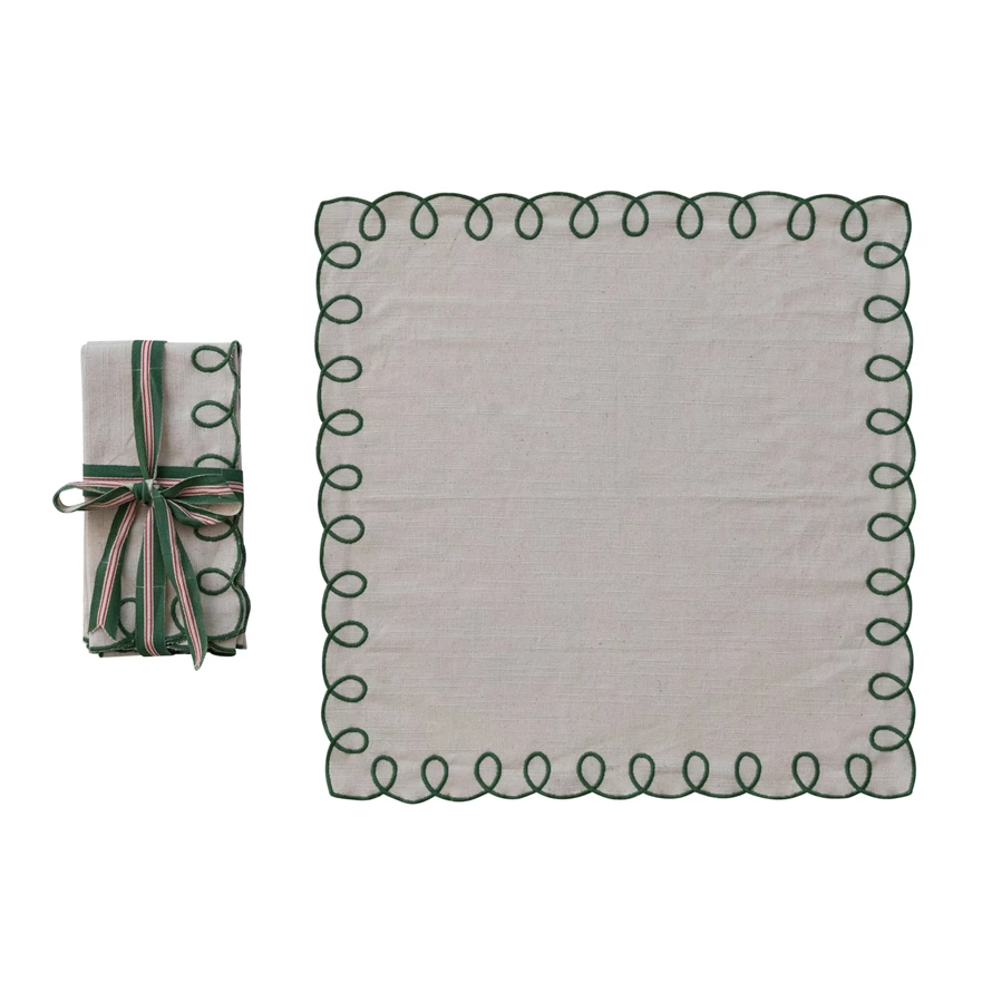 Catalog Name: 18" Square Cotton Scalloped Napkins w/ Embroidered Edges, Natural & Green, Set of 4 Tied w/ Striped Cotton Tape