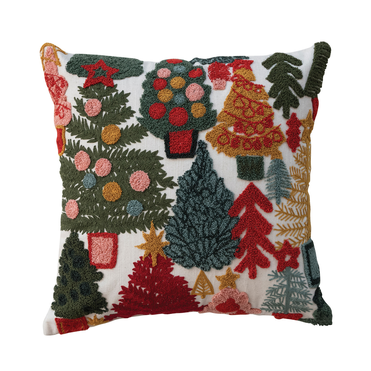 Catalog Name: 18" Square Cotton Slub Pillow w/ Embroidered Christmas Trees & Tufting, Multi Color