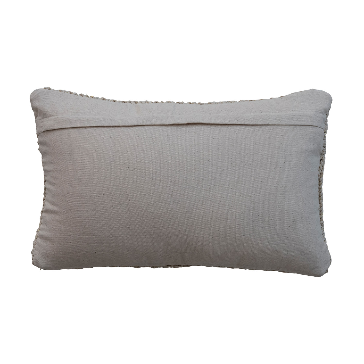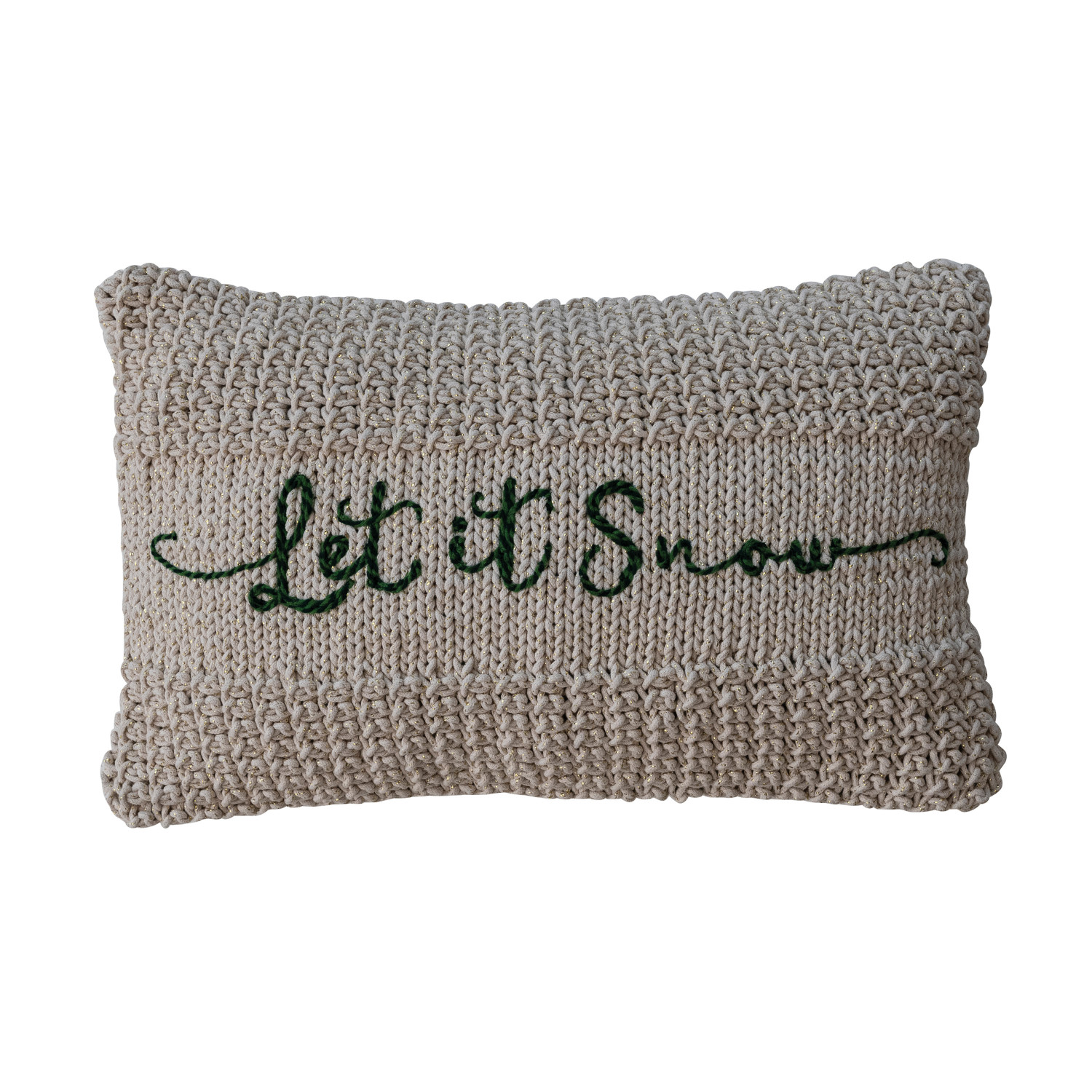 Catalog Name: 22"L x 14"H Cotton Knit Macrame Lumbar Pillow w/ Metallic Gold Thread Embroidery "Let It Snow", Natural & Green