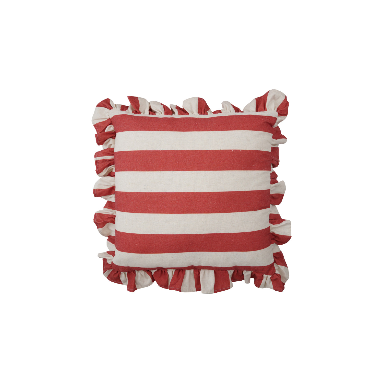 18" Square Fabric Striped Pillow with Ruffle, Red & Natural