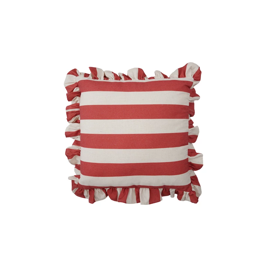 Catalog Name: 18" Square Fabric Striped Pillow w/ Ruffle, Red & Natural