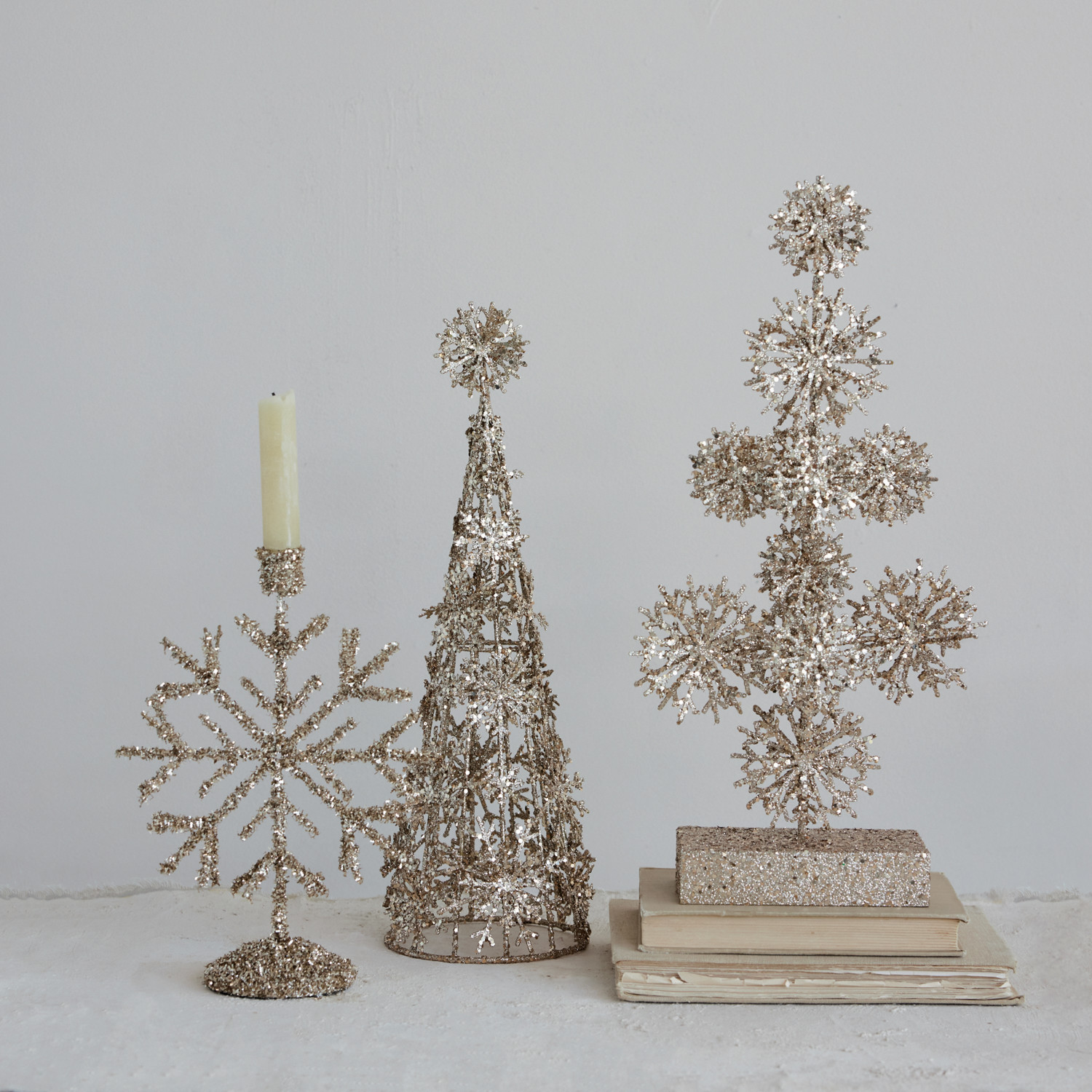 Catalog Name: 5-3/4" Round x 17-3/4"H Metal Tree w/ Snowflakes & Glitter, Champagne Finish