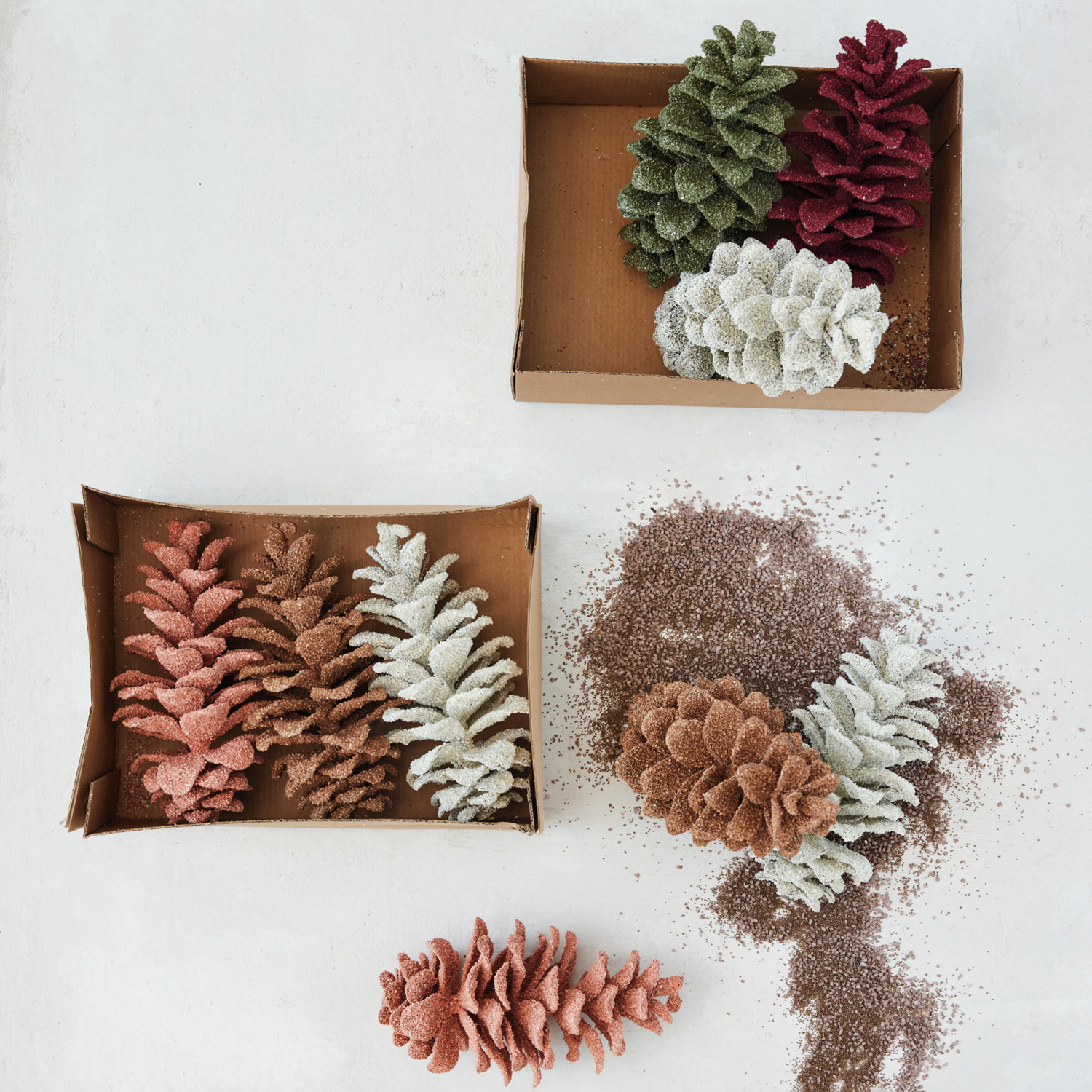 Faux Pinecones with Glitter, White, Green & Burgundy, Boxed Set of 3
