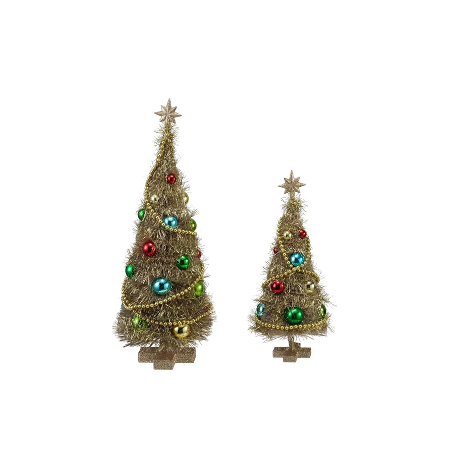 Catalog Name: 6" Round x 17"H & 5" Round x 13"H Sisal & Tinsel Vintage Reproduction Trees w/ Ornaments, Garland & Glitter Star/Base, Multi Color, Set of 2