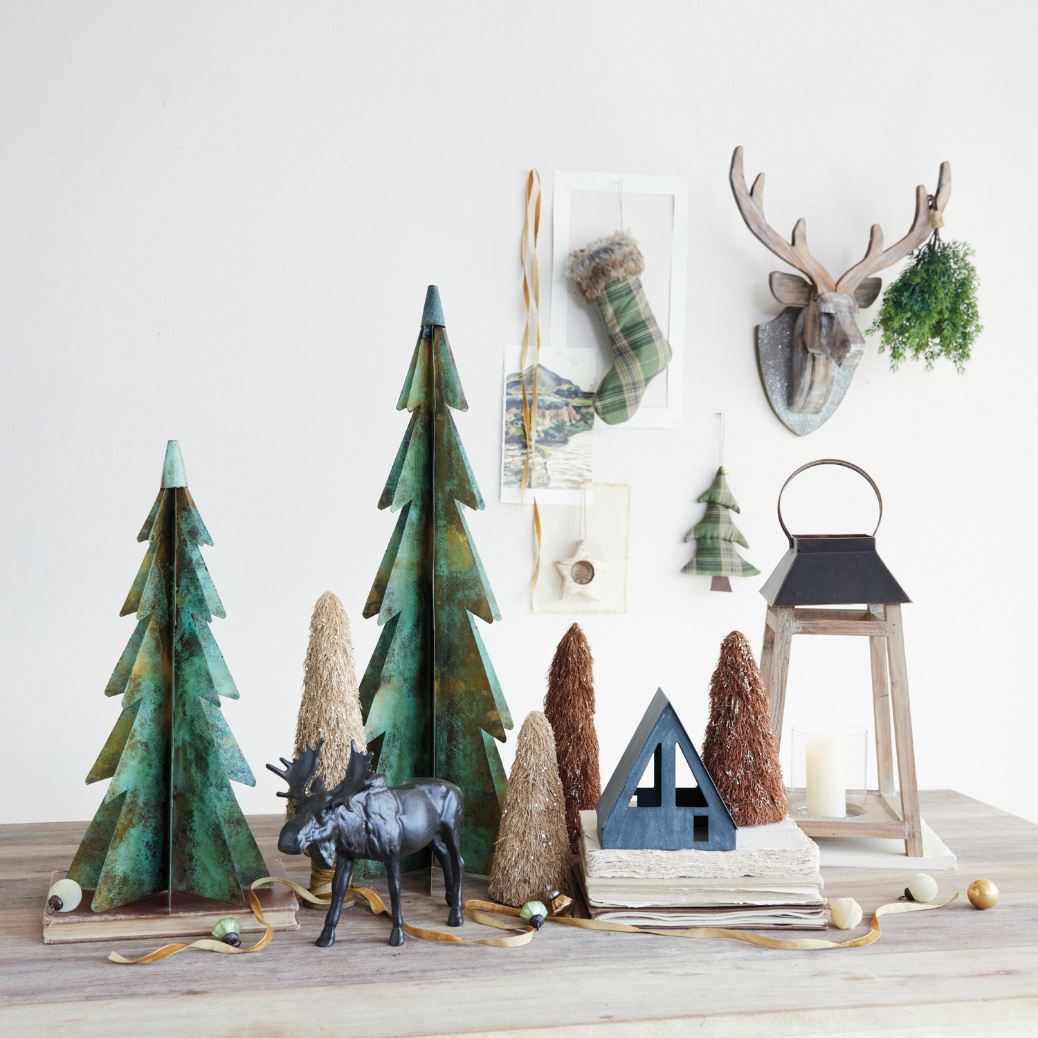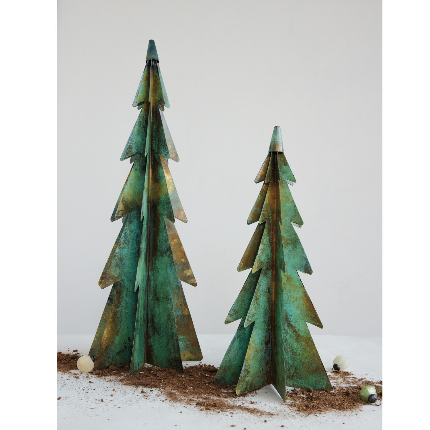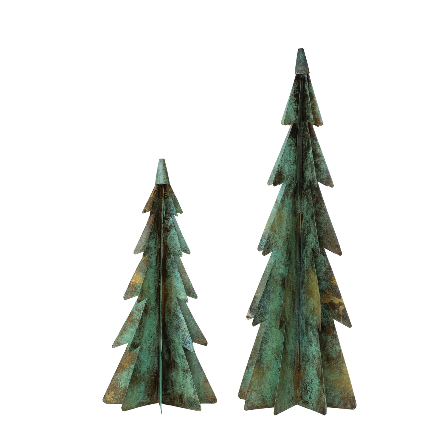 Metal Christmas Trees, Verdigris Finish, Set of 2