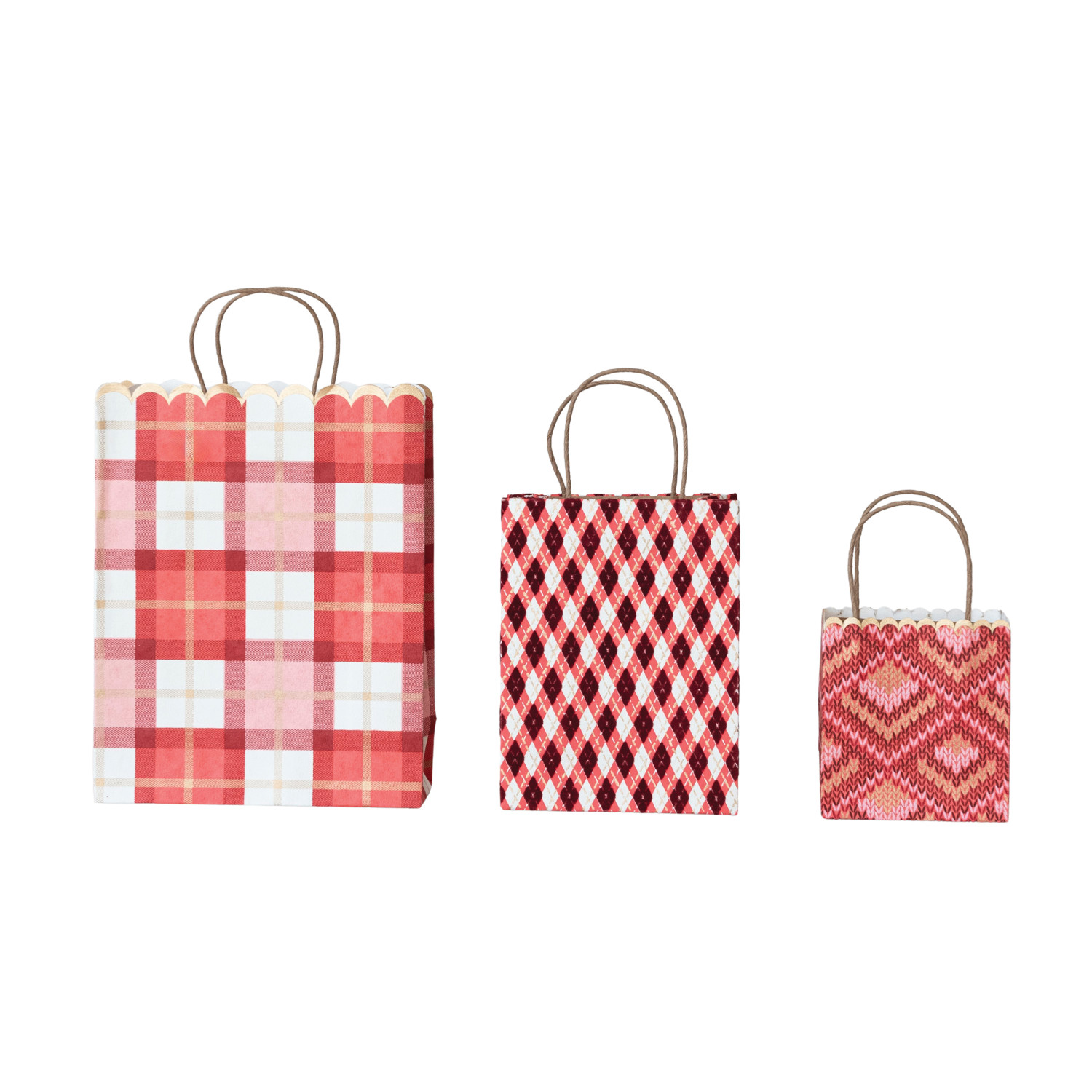 Catalog Name: 9"L x 4"W x 11-1/2"H, 6-1/2"L x 3-1/2"W x 8-1/2"H & 5"L x 3"W x 5-1/2"H Handmade Printed Scalloped Recycled Paper Gift Bags w/ Patterns, Multi Color, Set of 3