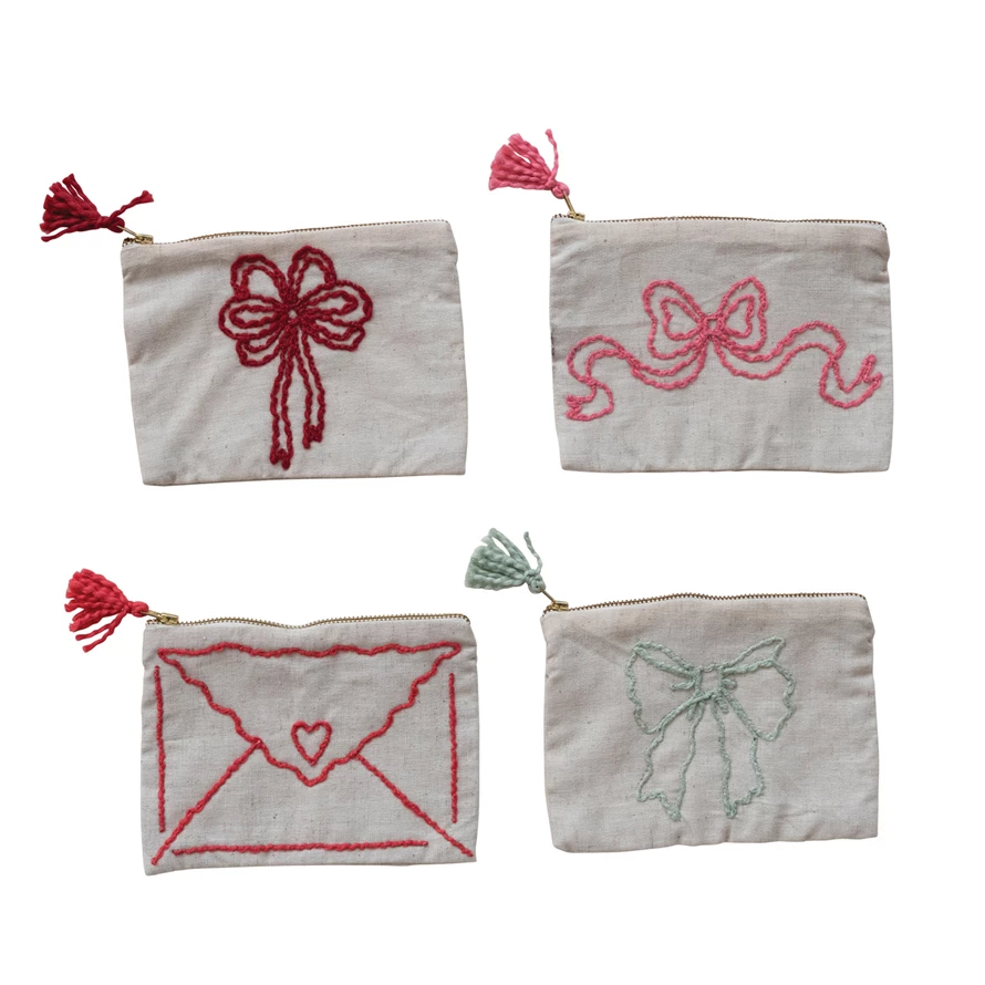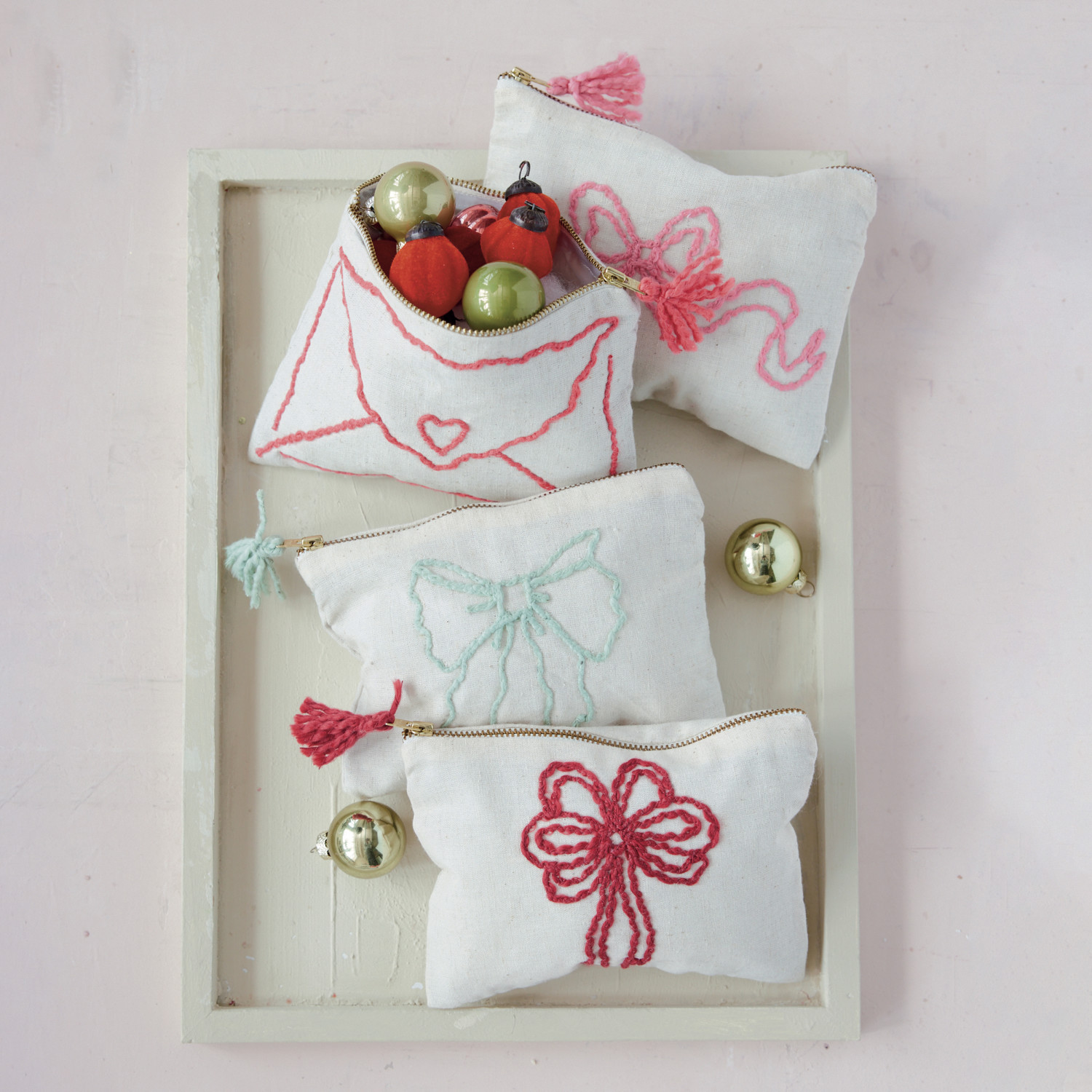 Catalog Name: 7"L x 5-3/4"W Cotton & Linen Zip Pouch w/ Embroidered Letter & Tassel, Multi Color, 4 Styles