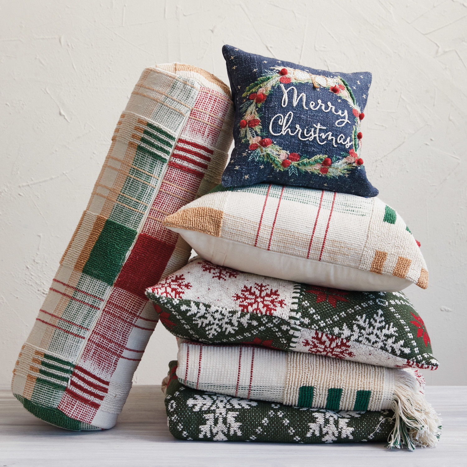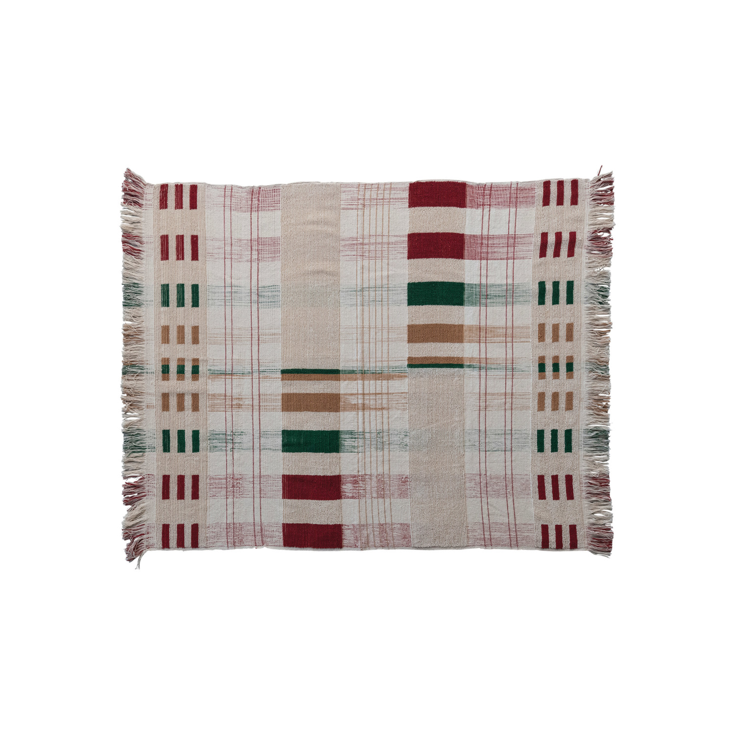 Catalog Name: 60"L x 50"W Woven Cotton Slub Throw w/ Fringe, Cream Color & Red Plaid