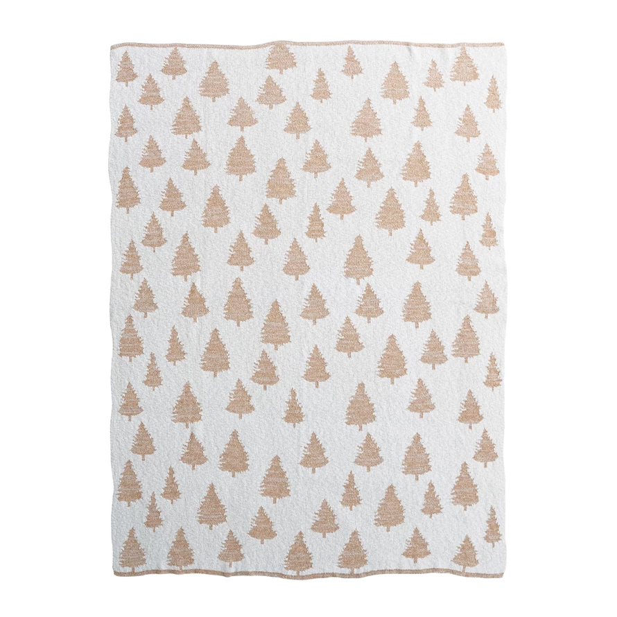 Cotton Knit Throw with Trees & Metallic Gold Thread, Cream Color