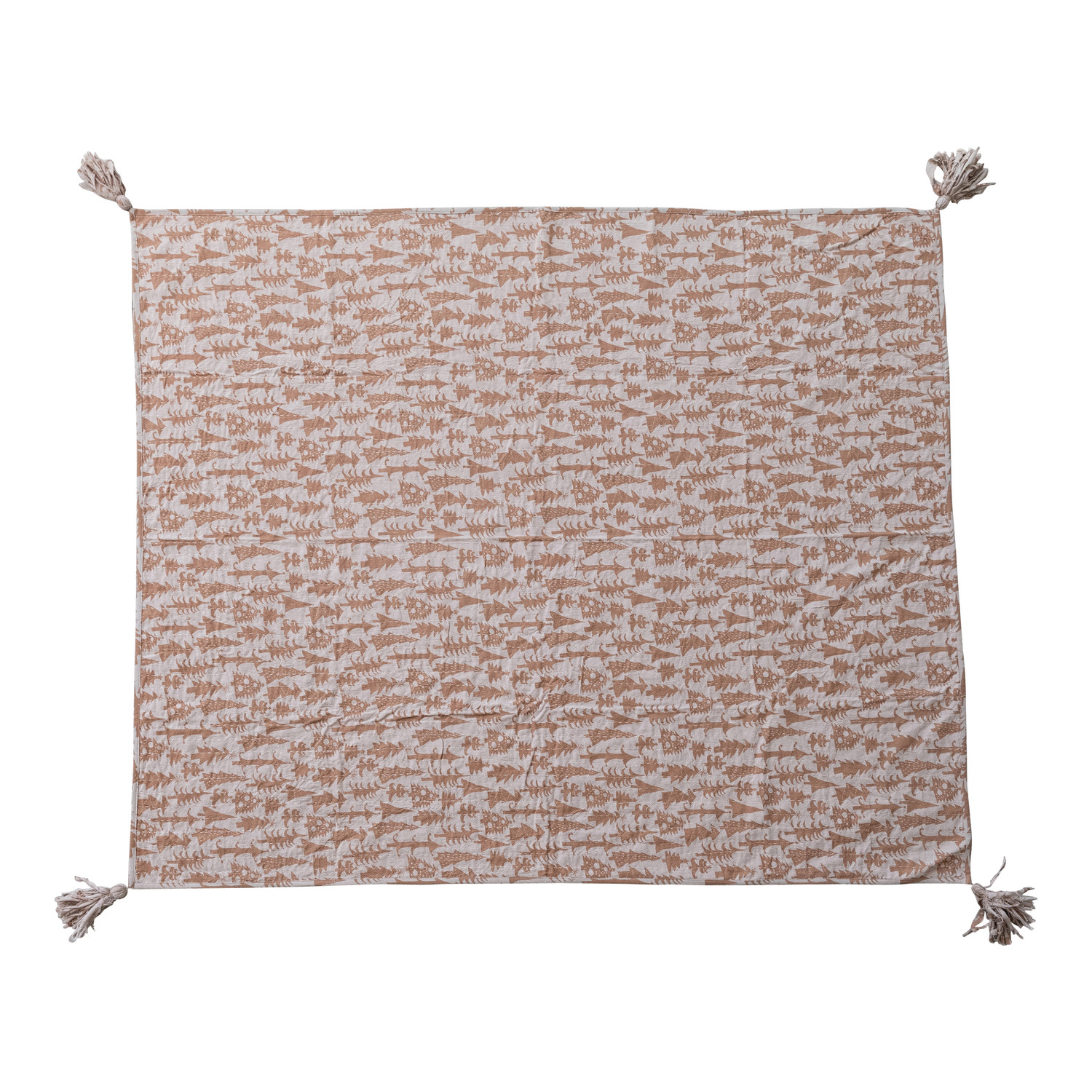 Catalog Name: 60"L x 50"W Stonewashed Voile Printed Throw w/ Trees Pattern, Hand-Embroidered Kantha Stitch & Tassels, Cream & Butterscotch Color ©