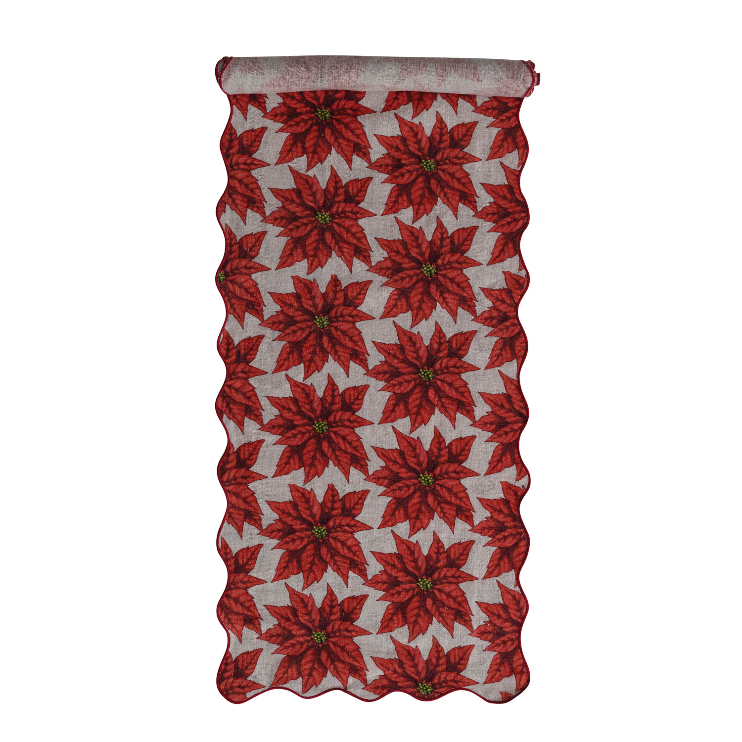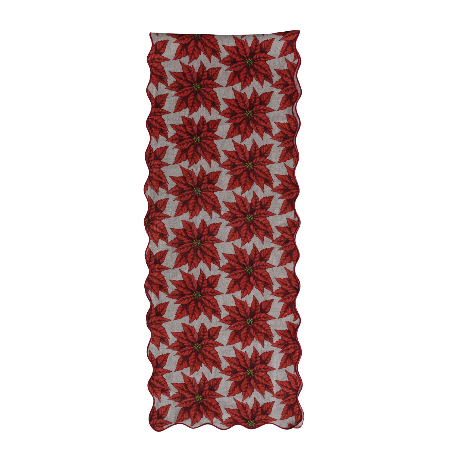 Linen Printed Scalloped Table Runner with Poinsettia Pattern & Stitched Edge & Red ©