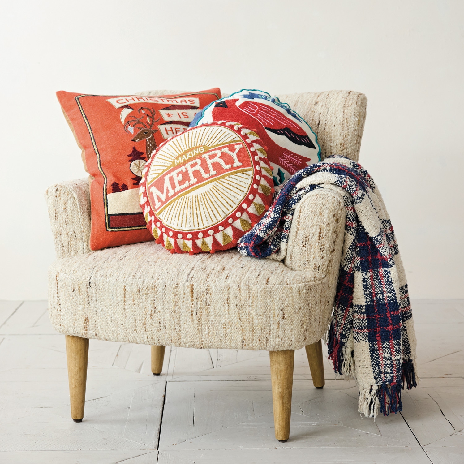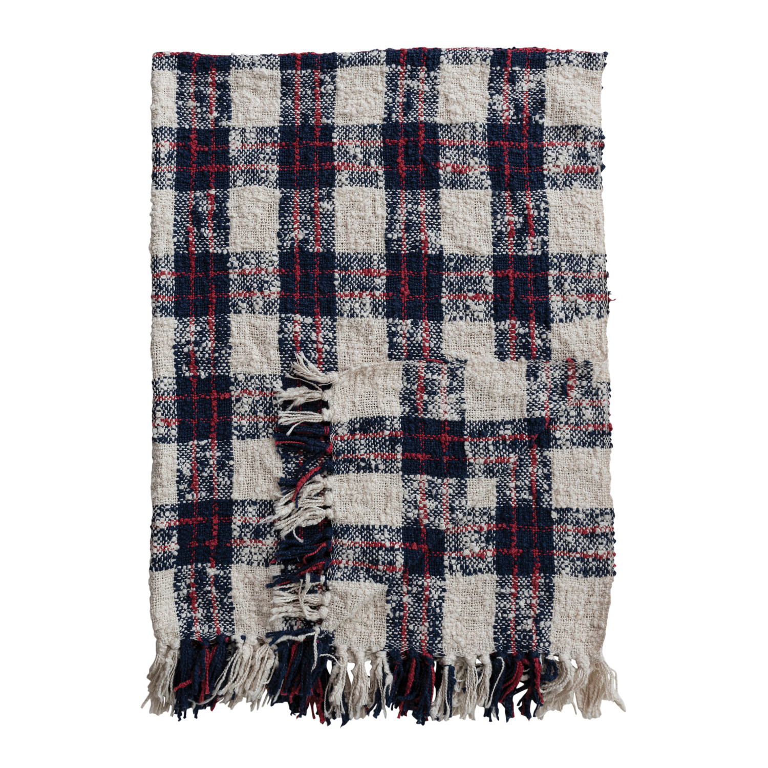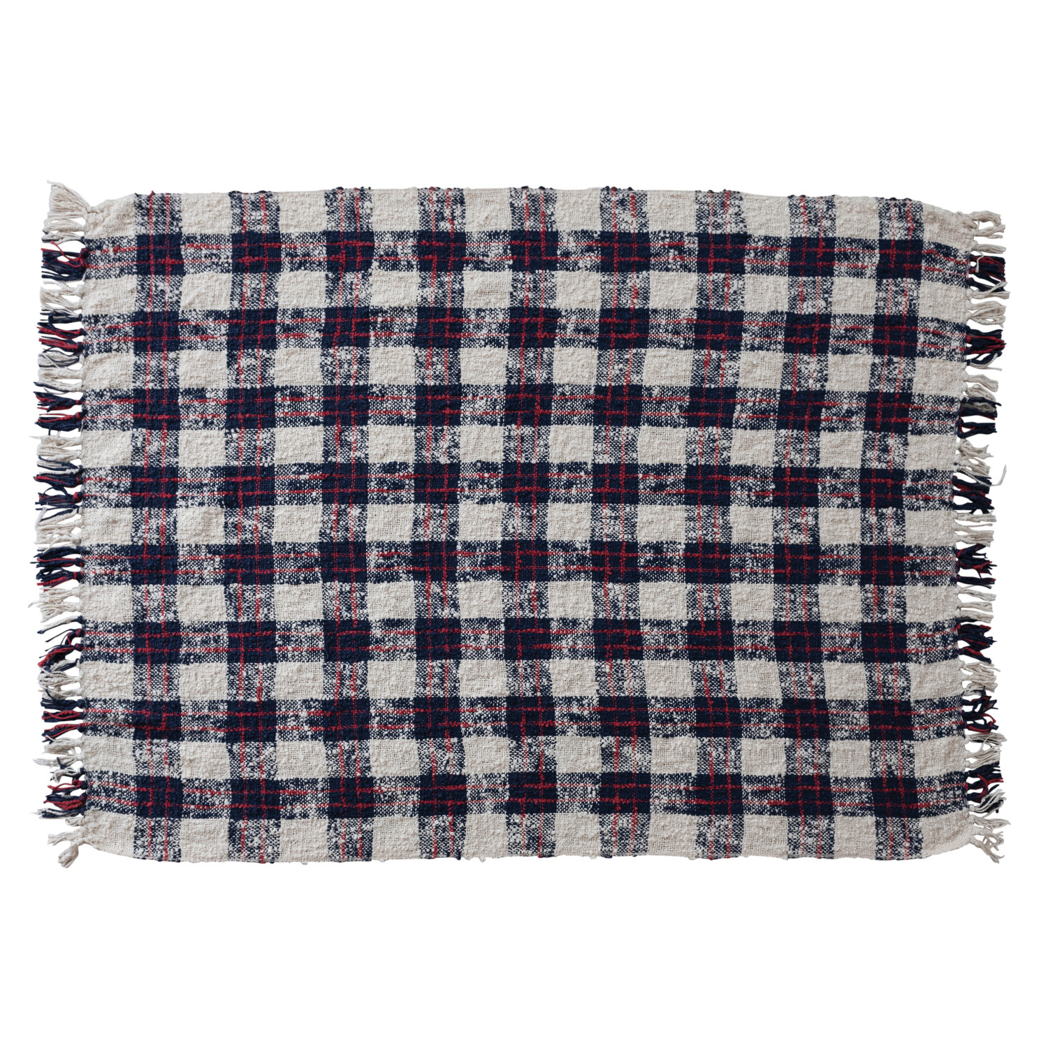Woven Cotton Throw with Buffalo Check Pattern & Fringe, Navy Color, Red & Natural