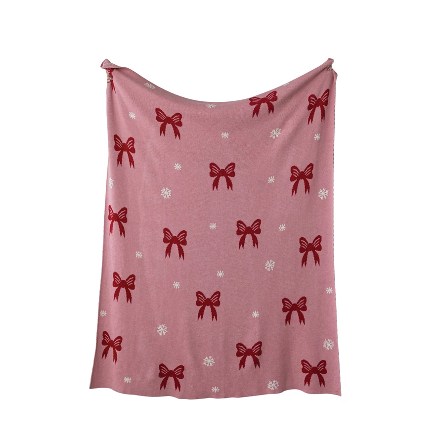 Cotton Knit Throw with Bow & Snowflake Pattern, Pink, Red & White