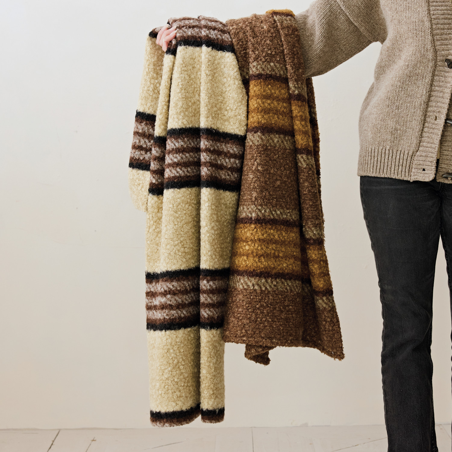 Fabric Faux Sherpa Throw with Stripes, Brown, Black & Yellow