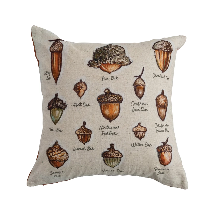 Catalog Name: 20" Square Cotton & Linen Printed Pillow w/ Acorns, Embroidery & Corduroy Back, Multi Color ©
