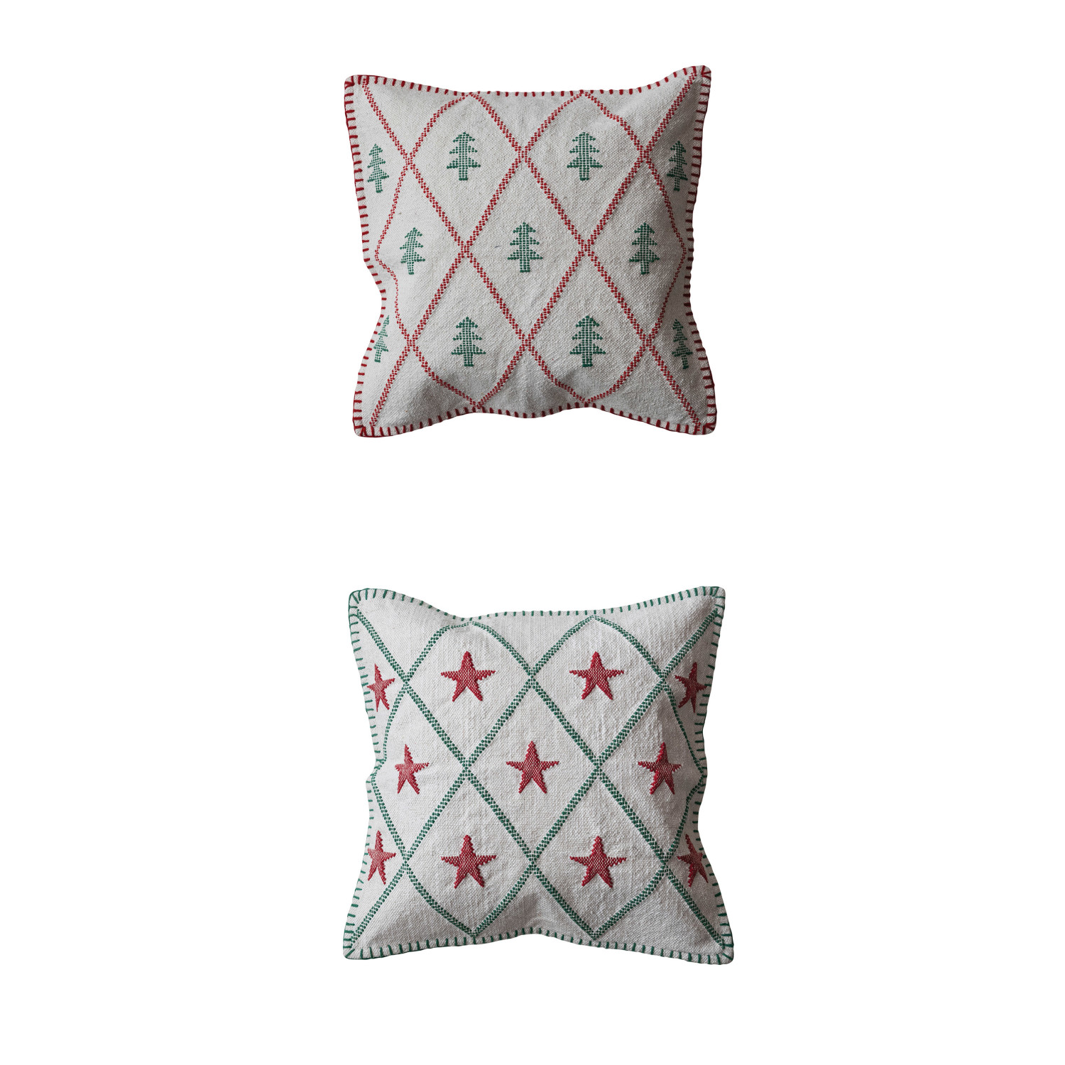 This woven cotton pillow with embroidered tree and star pattern, blanket stitch and chambray back set is a cozy and festive way to decorate the home. The pillow features a woven cotton fabric that has an embroidered tree and star pattern in multicolor, such as red, green, and natural, that creates a lovely contrast and a whimsical effect. The pillow has a blanket stitch that adds some detail and fun, and a chambray back that gives it a stylish and elegant look. The pillow has a polyester fill that makes it soft and comfortable, and provides support and cushioning. The pillow is made of cotton fabric that is durable, artistic, and easy to wash and maintain. It has a smooth and textured appearance that suits any style of decor, from Christmas to cottage. The pillow comes in two styles: red stars or green tree, each with its charm and character. Use it on the sofa, bed, or chair, or give it as a gift, a favor, or a statement piece, as this pillow will add some personality and warmth to any space. It also makes a great gift for friends and family who love cotton, tree, or star crafts. A cozy and festive pillow with woven cotton fabric, featuring an embroidered tree and star pattern, blanket stitch, and a chambray back in multicolor. A cheerful and charming accessory that can add some personality and warmth to any style of decor, from Christmas to cottage, with its tree and star design and colors. A soft and comfortable pillow with a polyester fill that provides support and cushioning.