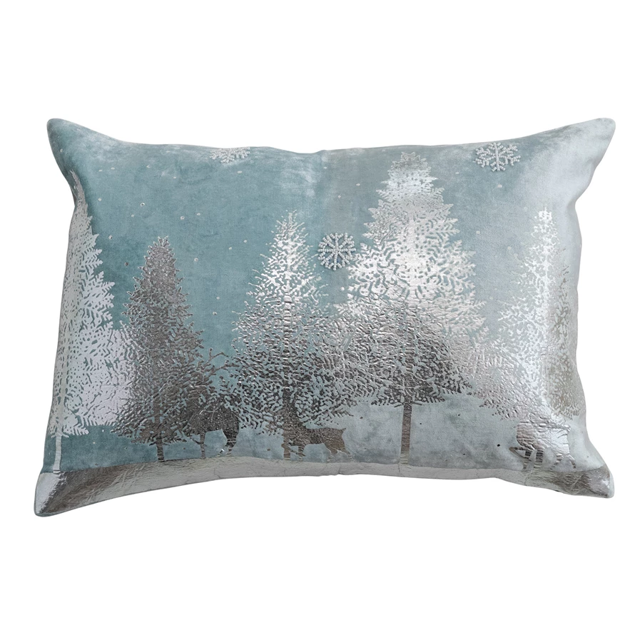 Velvet Lumbar Pillow with Silver Foil Trees & Beaded Snowflakes, Blue
