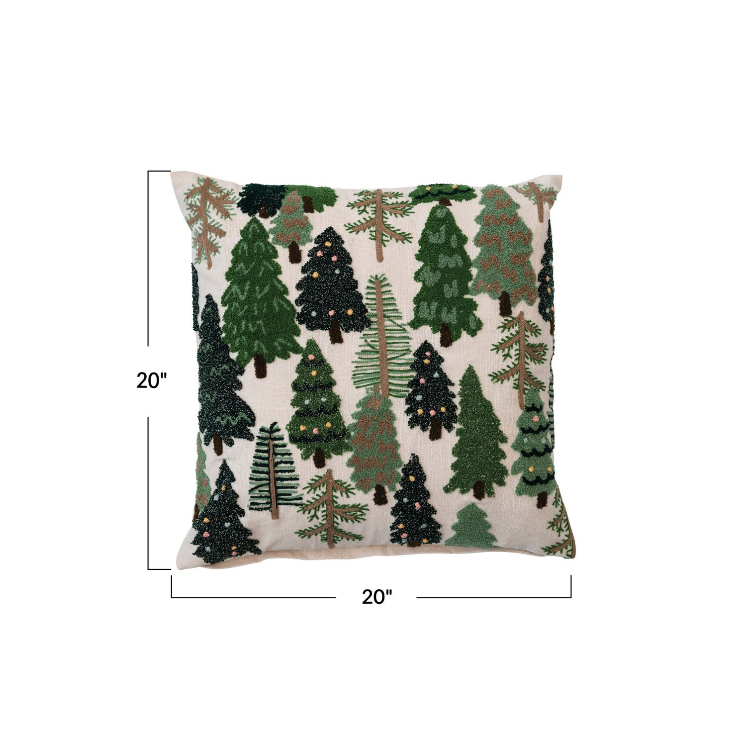 Catalog Name: 20" Square Cotton Slub Pillow w/ Embroidered & Tufted Christmas Trees, French Knots & Chambray Back, Multi Color