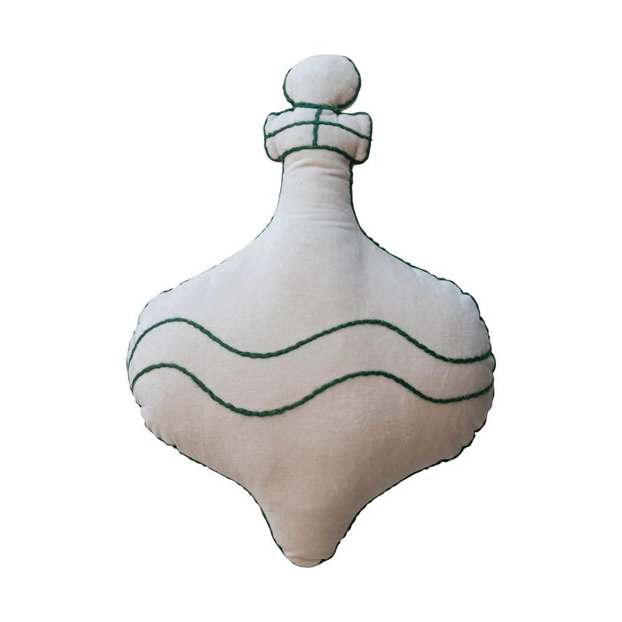 Catalog Name: 15"L x 10"W Cotton Velvet Ornament Shaped Pillow w/ Embroidery, Natural & Green