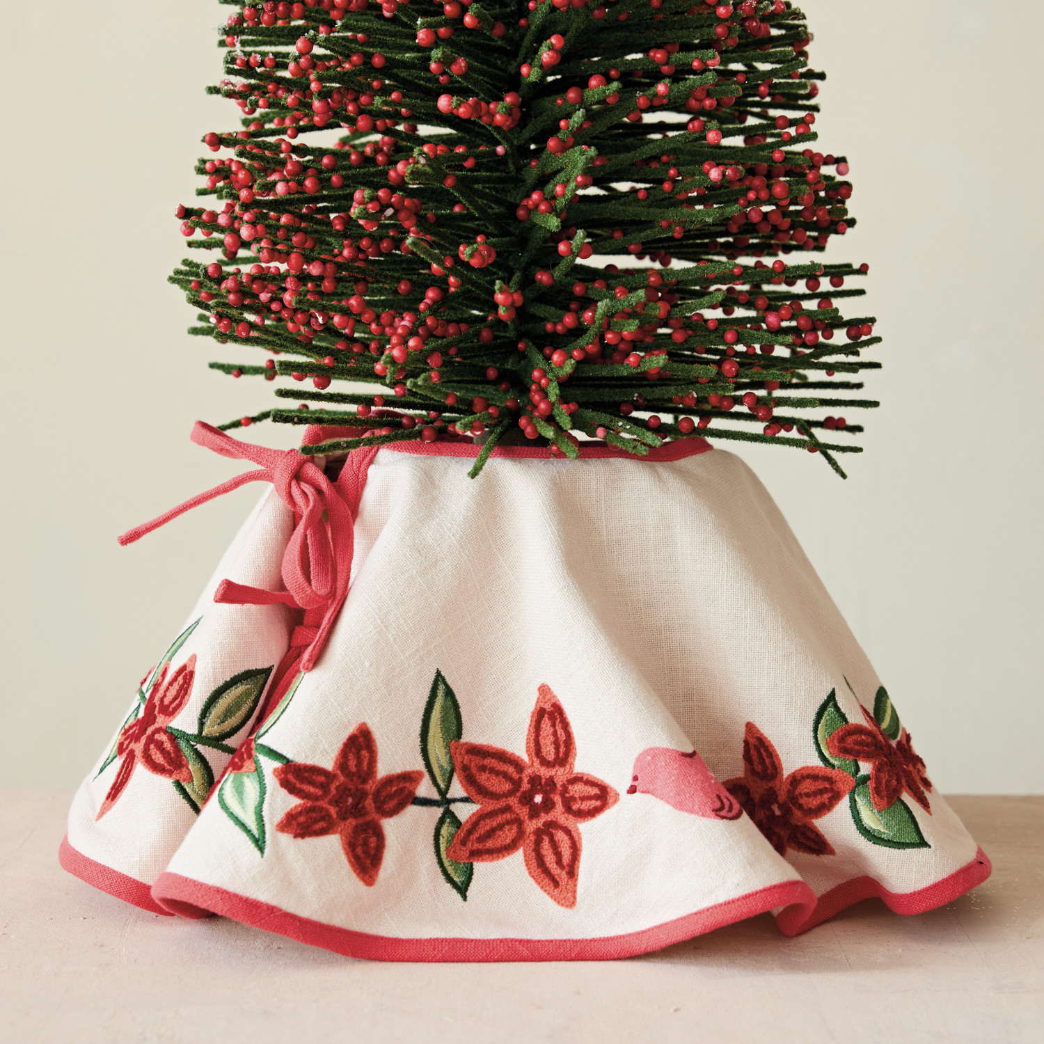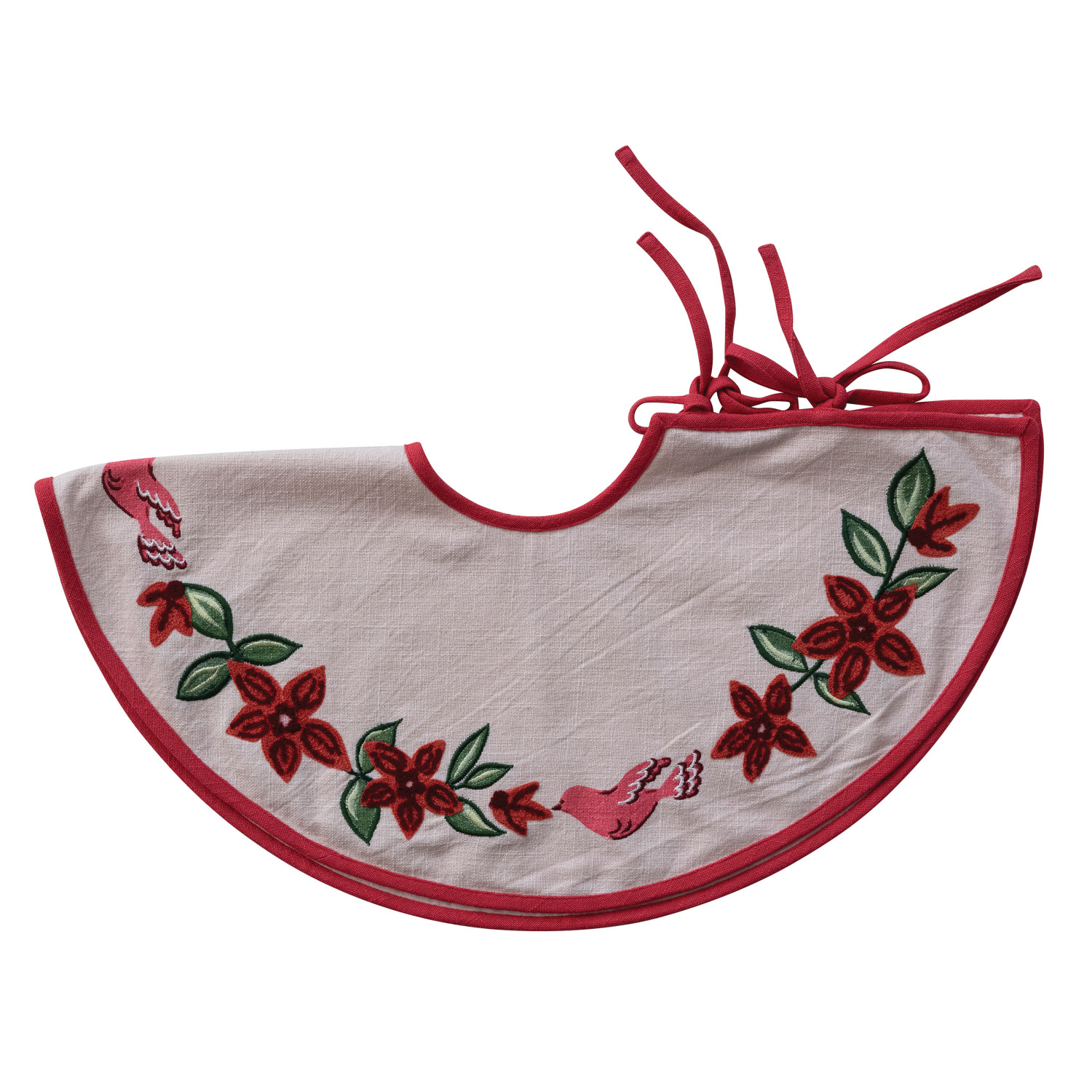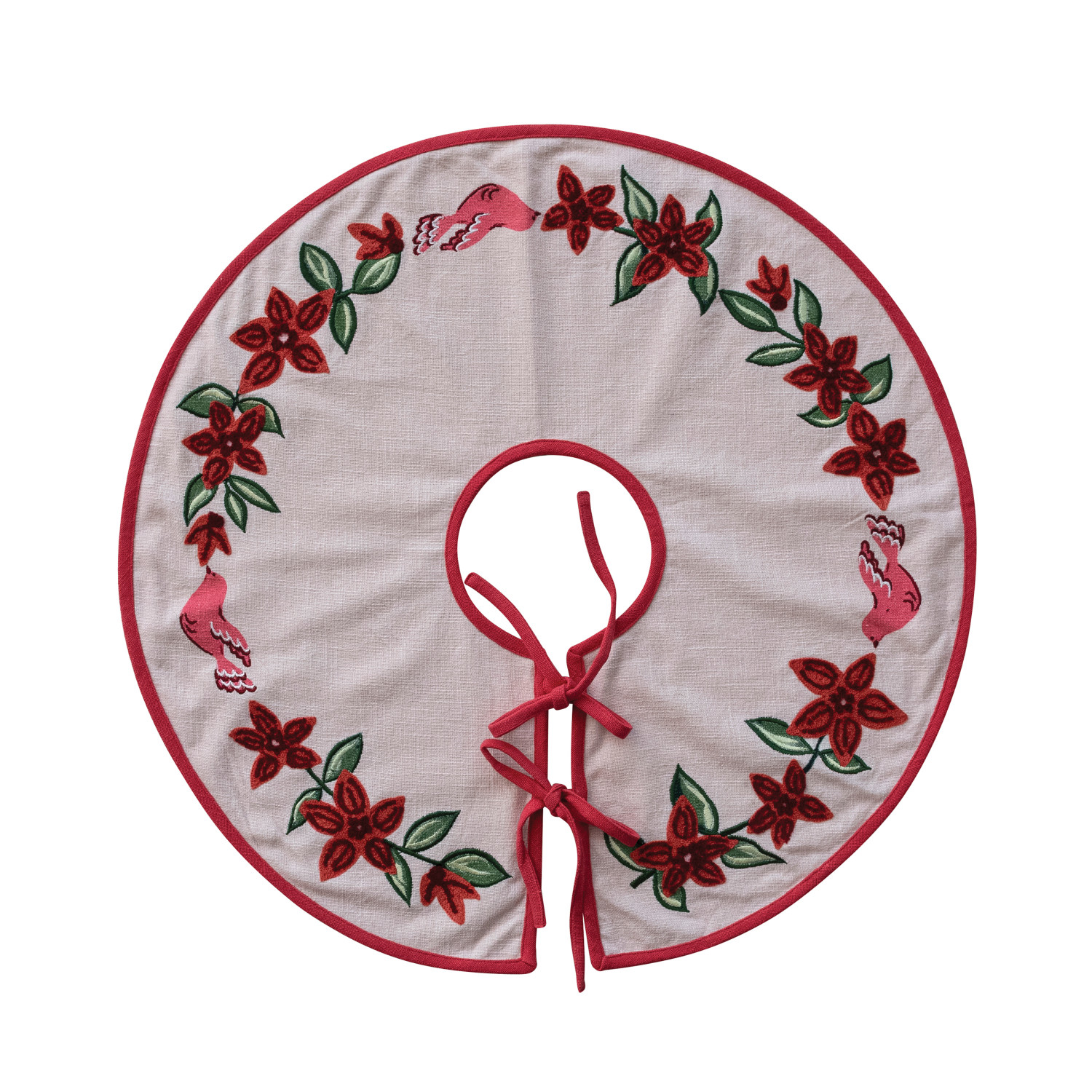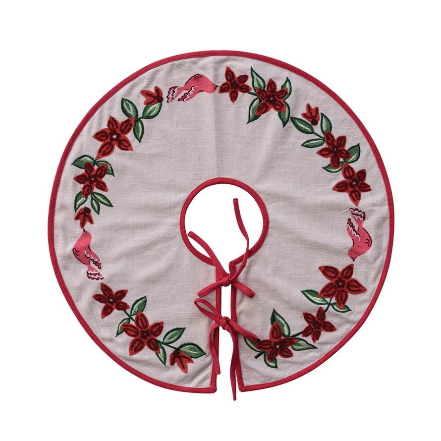 24" Round Cotton Printed Tree Skirt with Birds, Poinsettias, Embroidery & Ties ©
