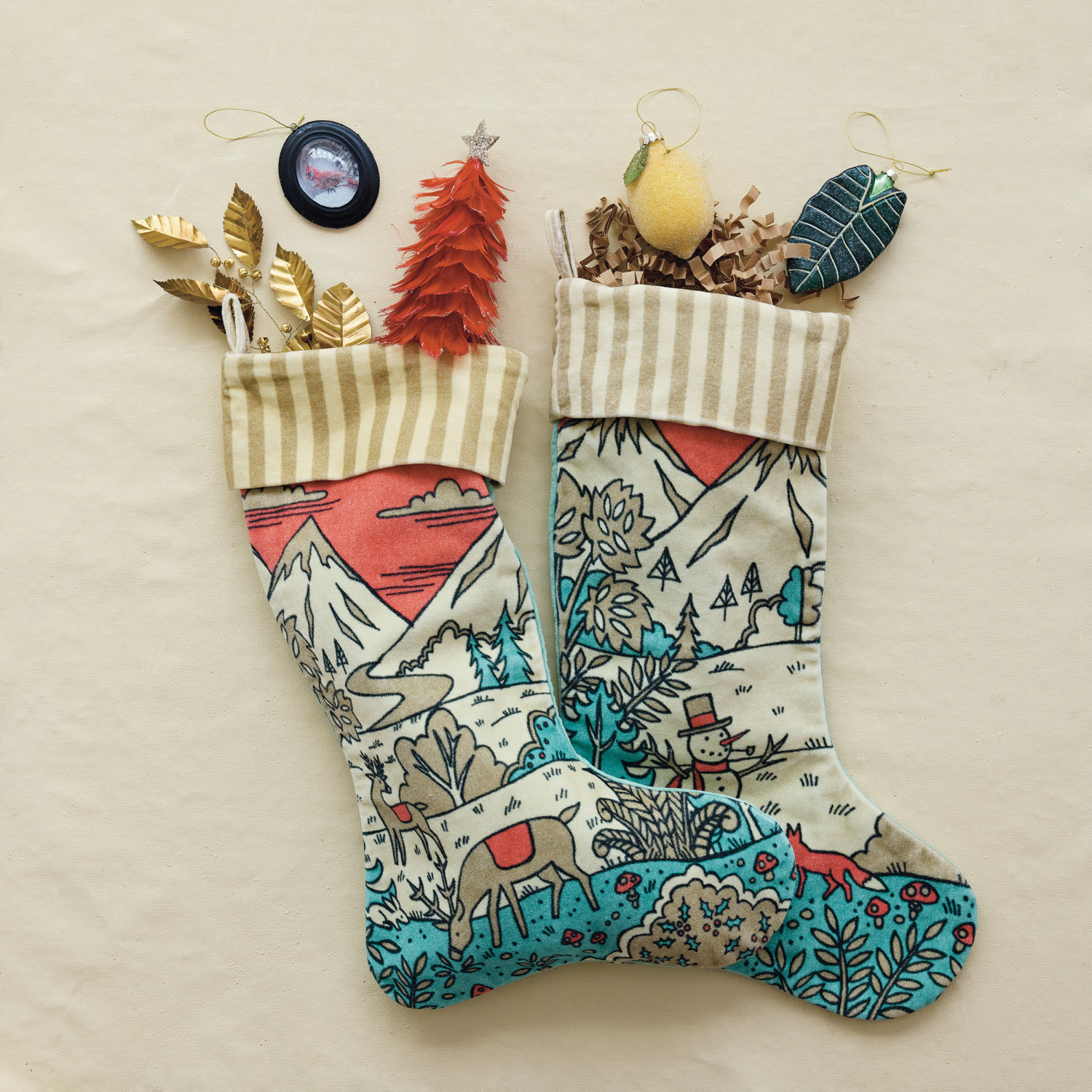 Cotton Velvet Stocking with Winter Scene, Reindeer & Striped Cuff, 2 Styles ©