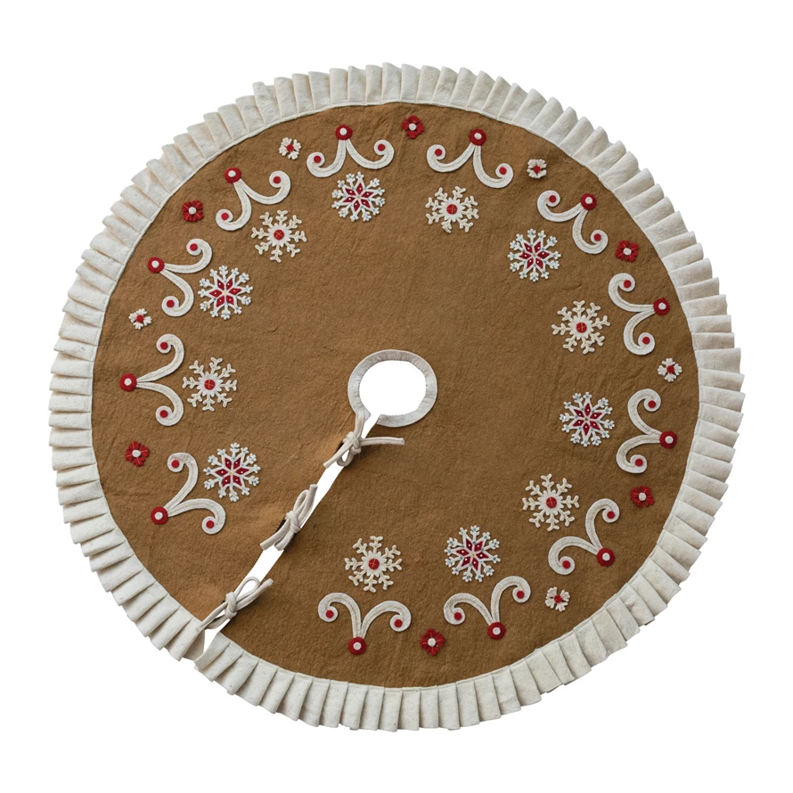 Catalog Name: 48" Round Handmade Wool Felt Tree Skirt w/ Snowflakes, Embroidery, Applique, Ruffle & Ties, Brown, Cream Color & Red
